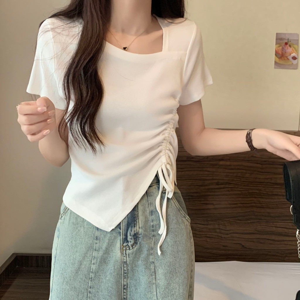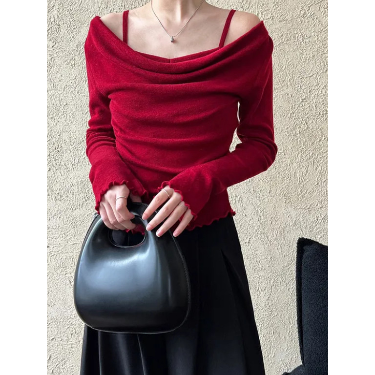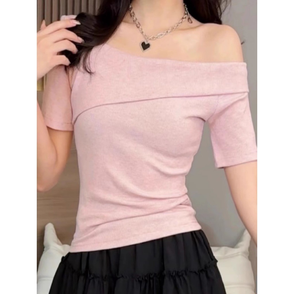 EMITA BLOOM baju off shoulder wanita wanita korean style small lengan panjang plain t shirt slim fit beige vintage