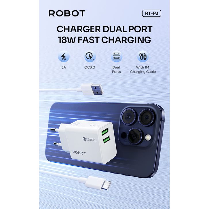 Robot RT-P3 Adapter Charger Suit Dual Port USB A Fast Charging 18W With Kabel