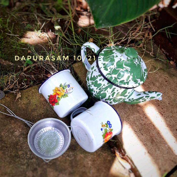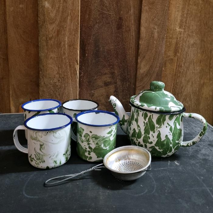 Set Teko cebol + Gelas 7cm Enamel + Saringan Teh vintage Bunga Hijau tea set