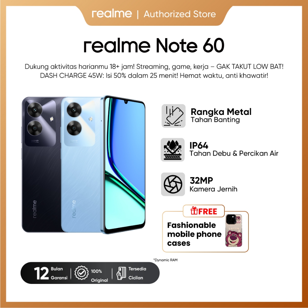 realme Note 60 6+128GB + Warna Hitam/Biru + set UNISOC T612 + Kamera 32MP HD | Tahan Air IP64+Garansi Resmi