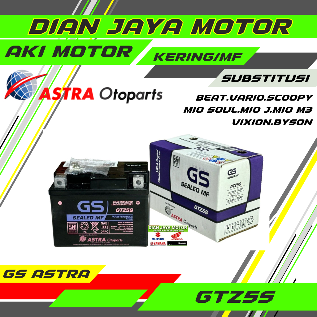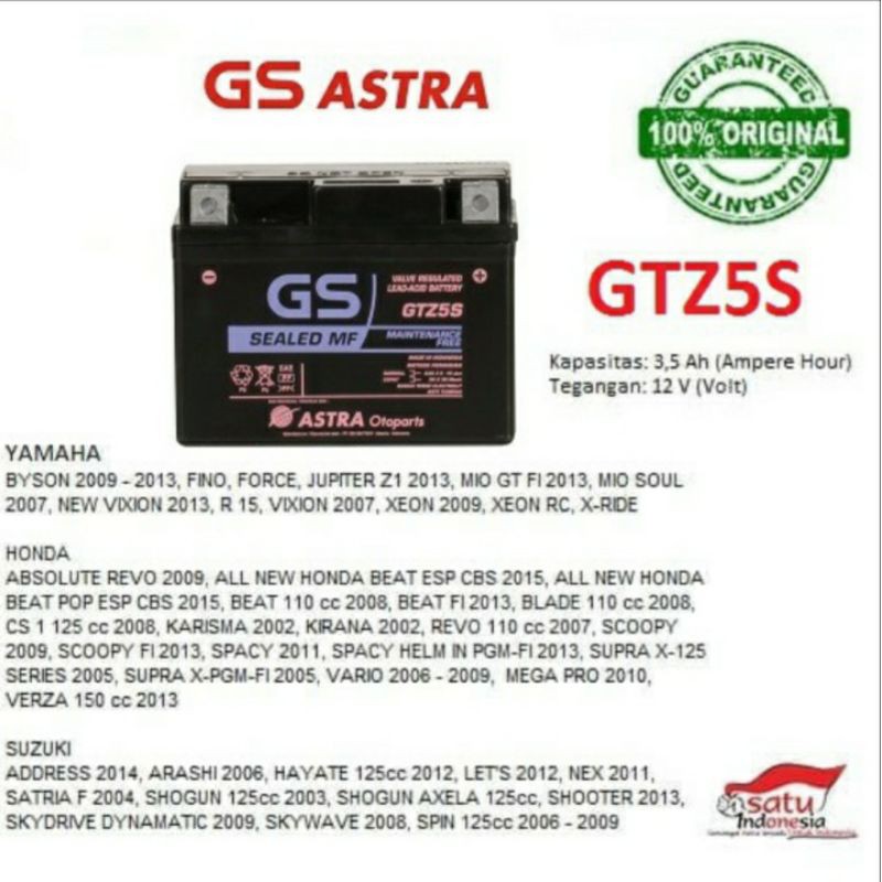 (GS ASTRA) Aki GTZ5S Honda Beat 3,5 Amper Scoopy Spacy Vario 110 Mio J Mio GT Soul GT