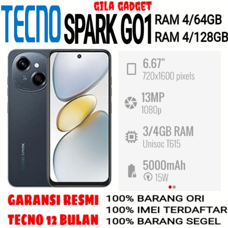 TECNO SPARK GO1 RAM 4/64GB + RAM 4/128GB GARANSI RESMI