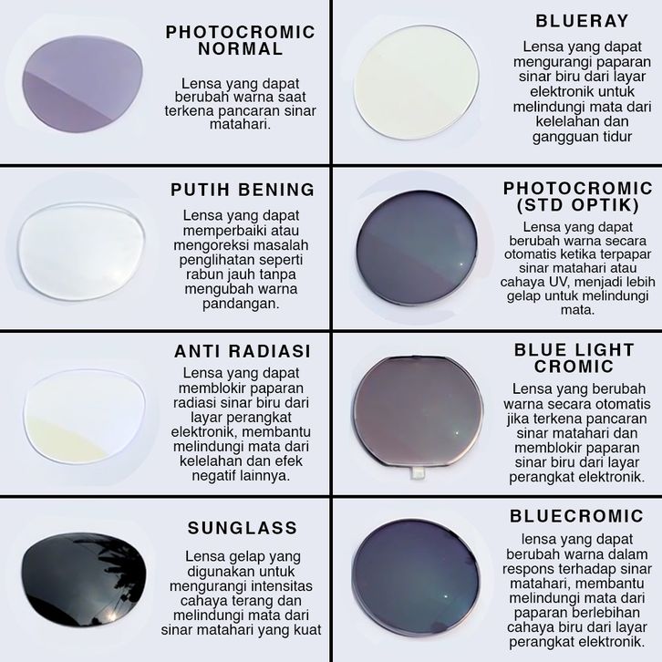 Photocromic NORMAL, Phtocromic+AR normal, - 0.50 photocromic, - 0.75 photocromic, - 1.00 photocromic, - 1.25 photocromic, - 1.50 photocromic, - 1.75 photocromic, - 2.00 photocromic, - 2.25 photocromic, - 2.50 photocromic, -2.75atau-3.00 photo, - 3.50 photocromic, - 4.00 photocromic, - 4.50 photocromic, - 5.00 photocromic, R/L beda photocromic, +0.50s/d +3.00 photo, Anti Radiasi normal, - 0.50 AR, - 0.75 AR, - 1.00 AR, - 1.25 AR, - 1.50 AR, - 1.75 AR, - 2.00 AR, - 2.25 AR, - 2.50 AR, - 2.75 atau -3.00 AR, - 3.50 atau -4.00 AR, - 4.50 atau -5.00 AR, Kanan/Kiri Beda AR, +1.00 s/d +3.00 AR