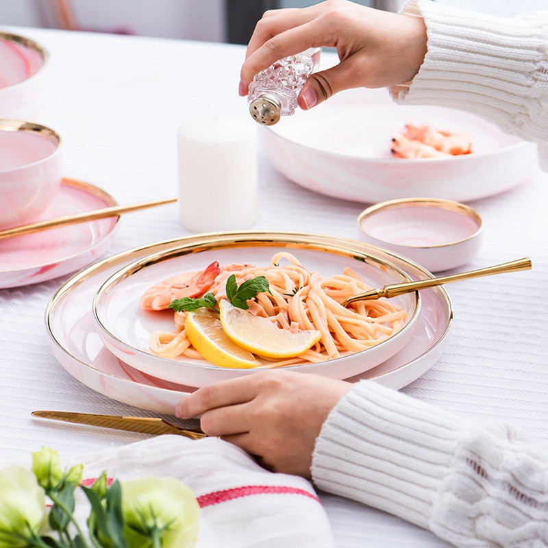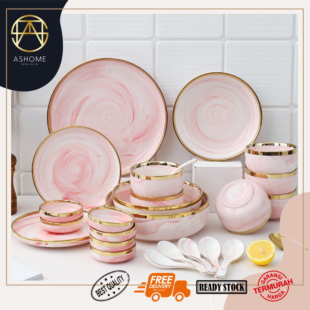 ASHOME Piring Keramik Pink Marble List GOL& Elegan / Piring Keramik Motif Marmer Pink List EM45 Elegan Mewah
