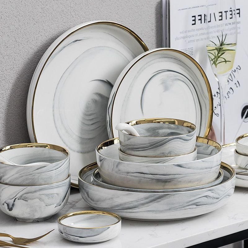 ASHOME Piring Makan Keramik Abu Marble List GOL& / Piring Abu Marble Keramik List GOL& / Mangkuk Keramik Abu Marble GOL& Elegan