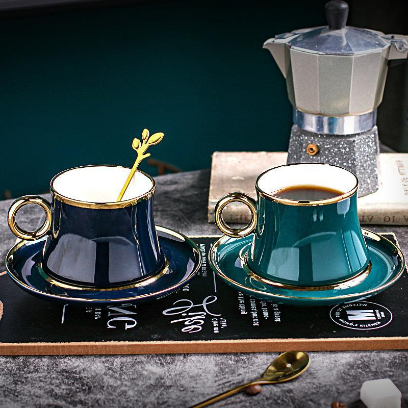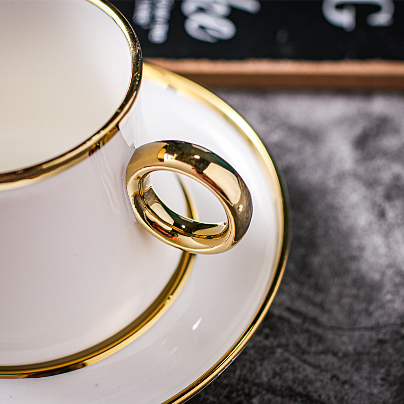 ASHOME Cangkir Keramik List GOL& Elegan Dengan Sendok dan Piring / Ceramic Tea Cup Elegant / Cangkir Kopi Aestetik / Cangkir Teh Mewah