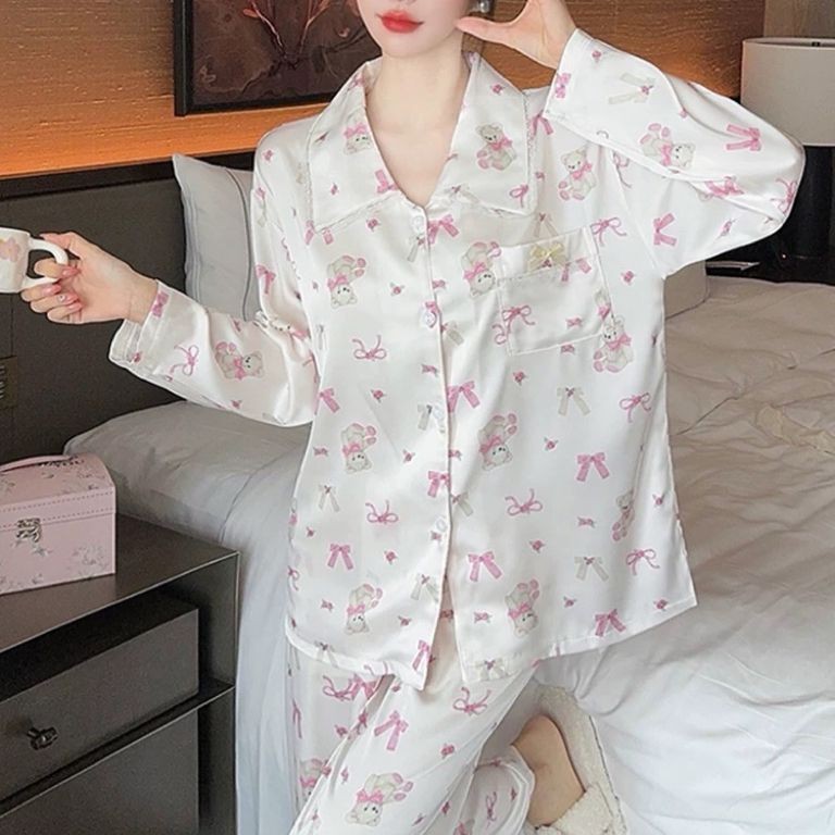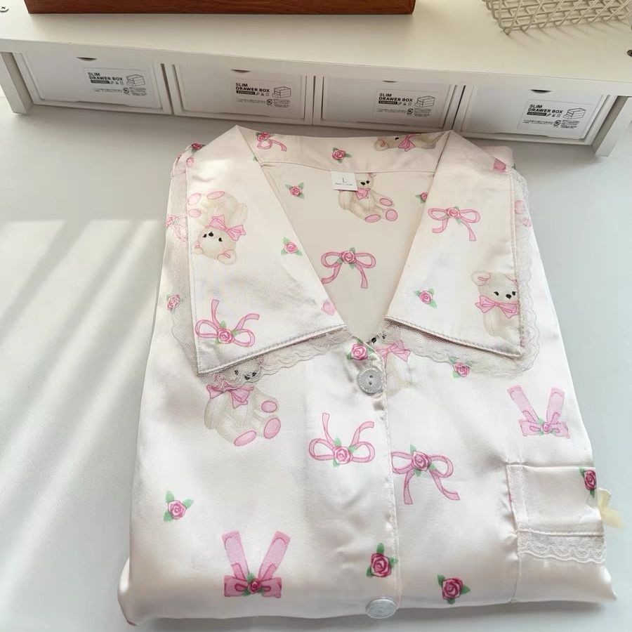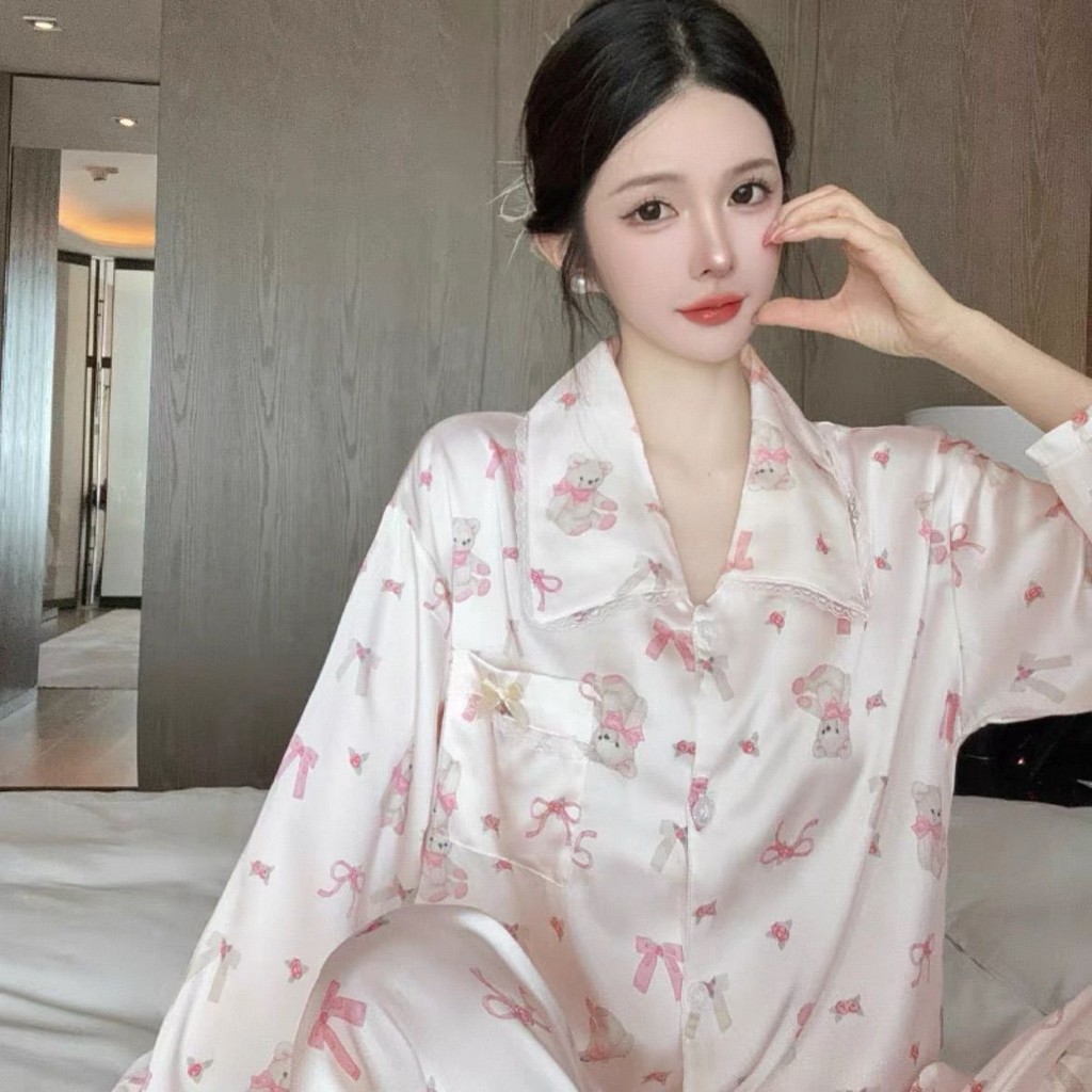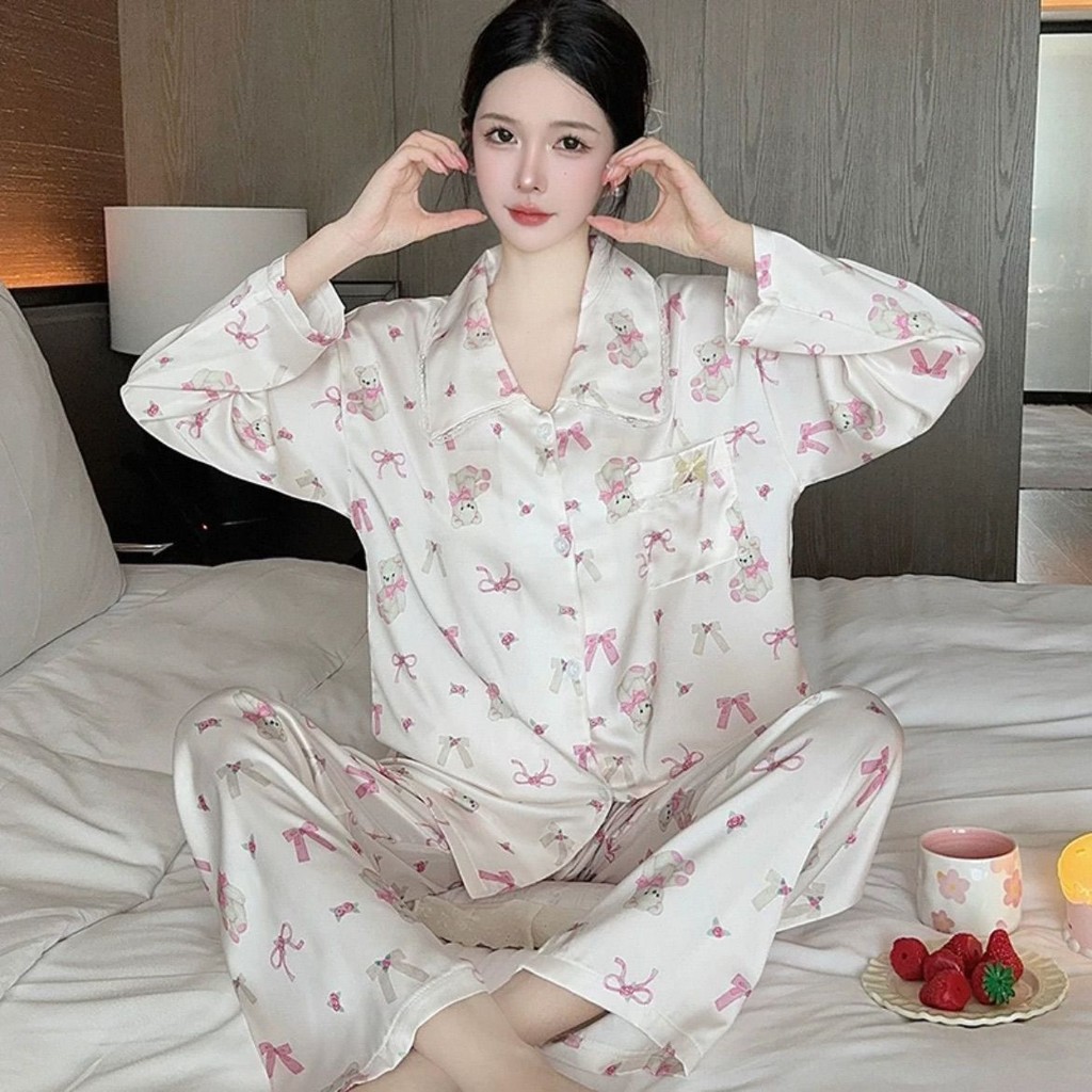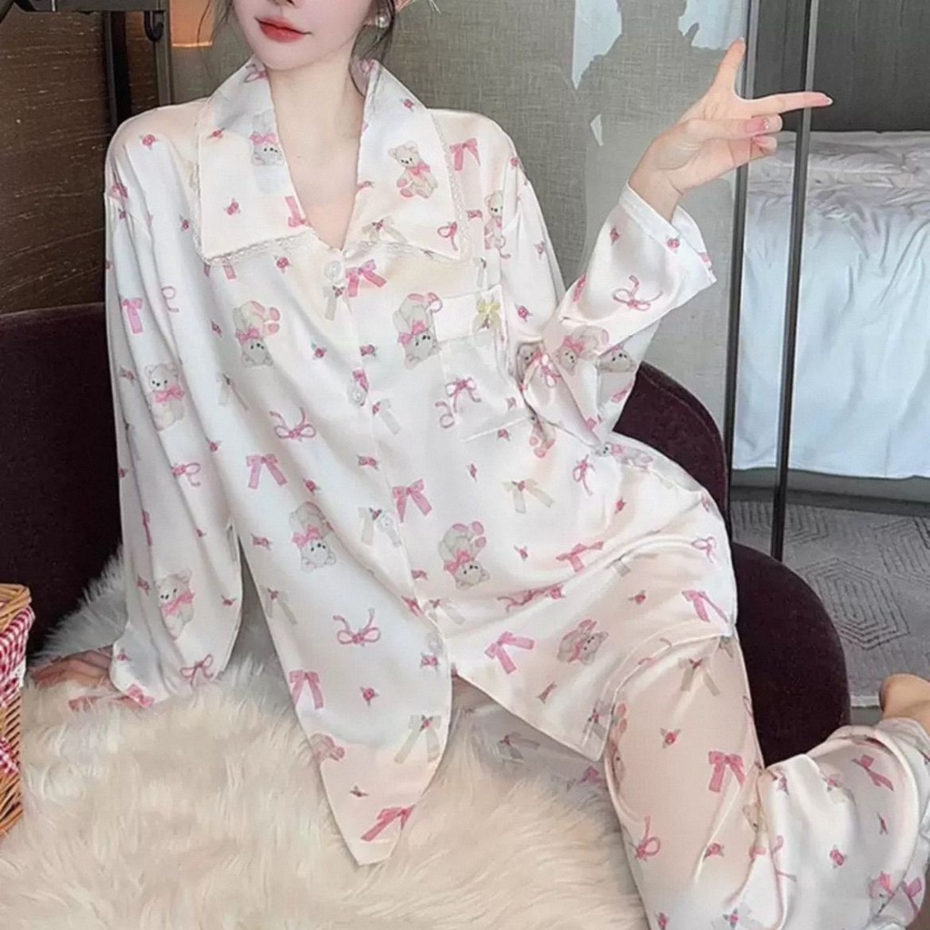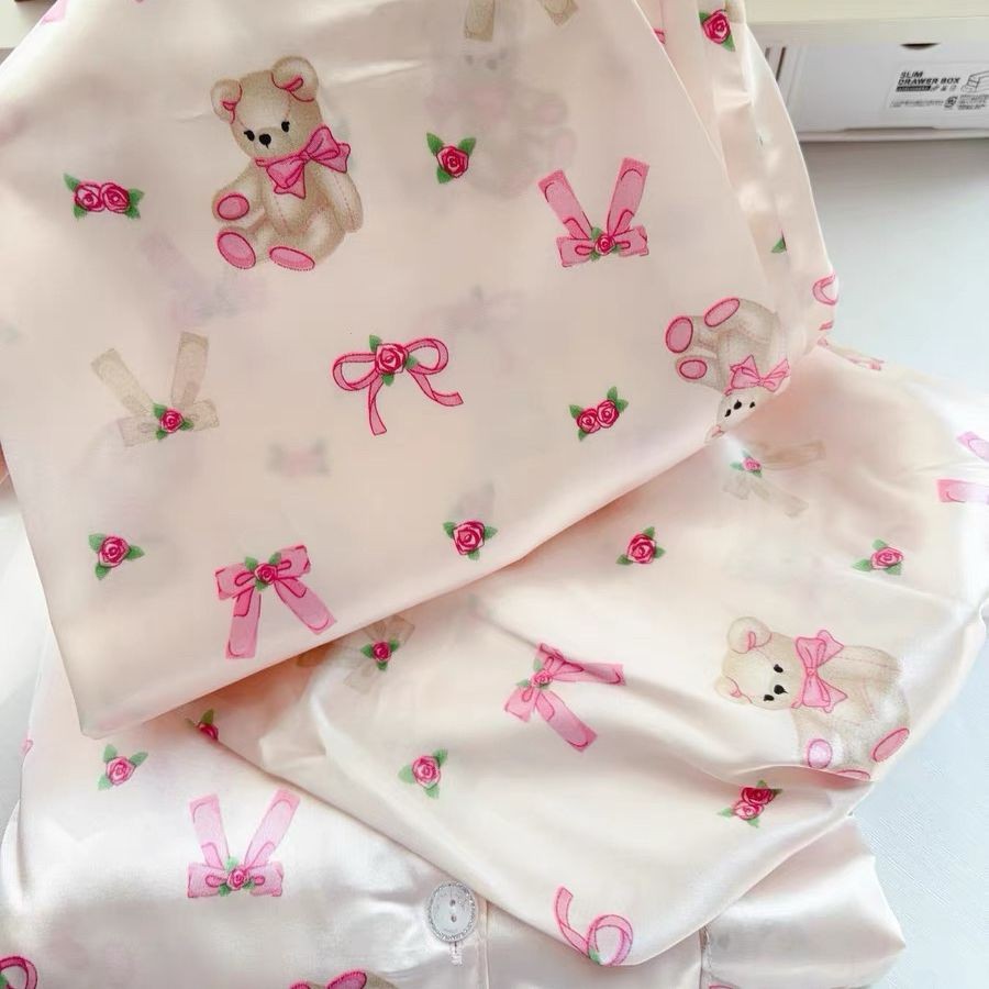 [ READY ] Baju Tidur Lengan Panjang Satin Setelan Bear Coquette Oneset Wanita Baju Tidur Satin Lengan Panjang A40