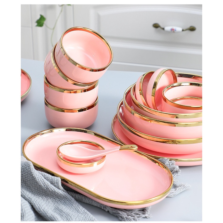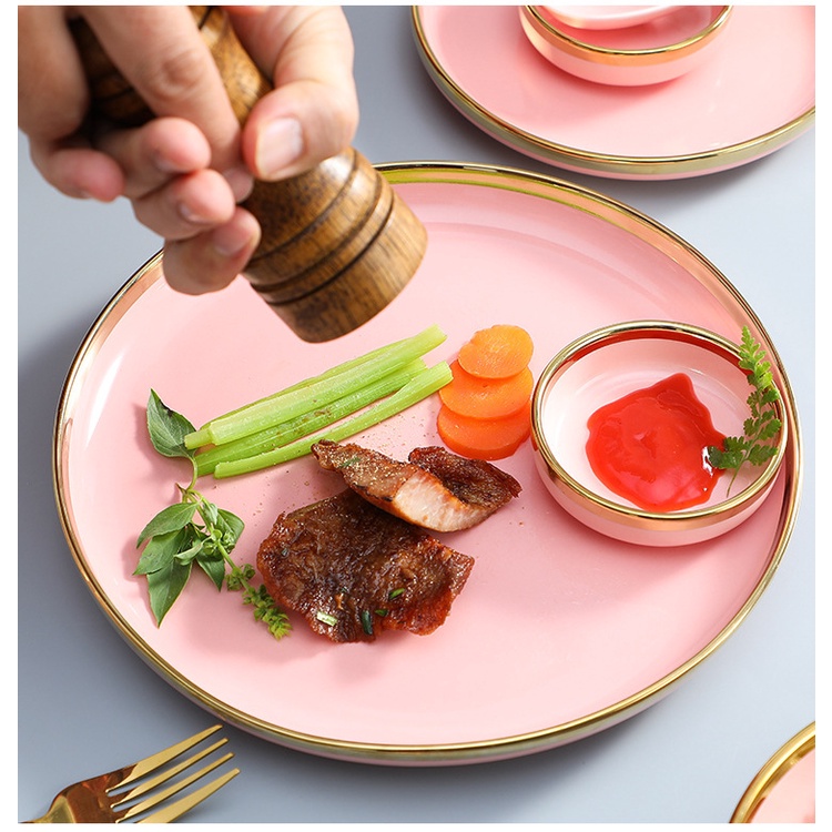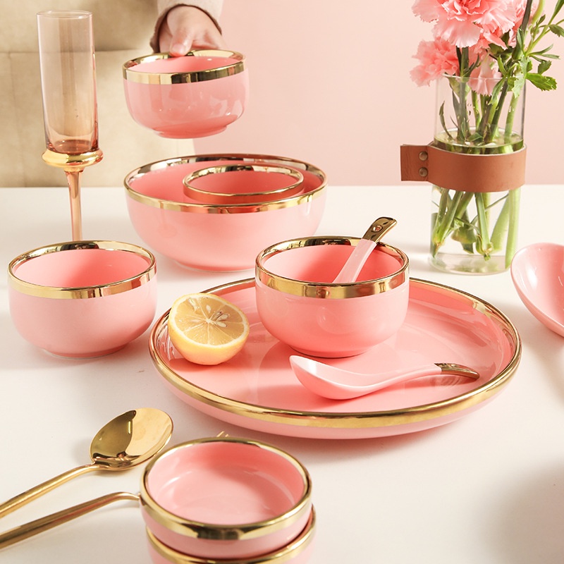 ASHOME Piring Makan Keramik Pink GOL& / Piring Pink Keramik List GOL& / Mangkuk Keramik Pink GOL& Elegan / Piring Keramik Mewah