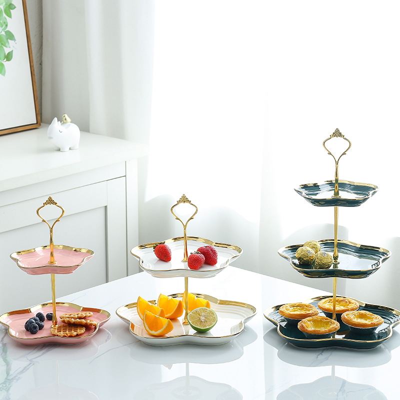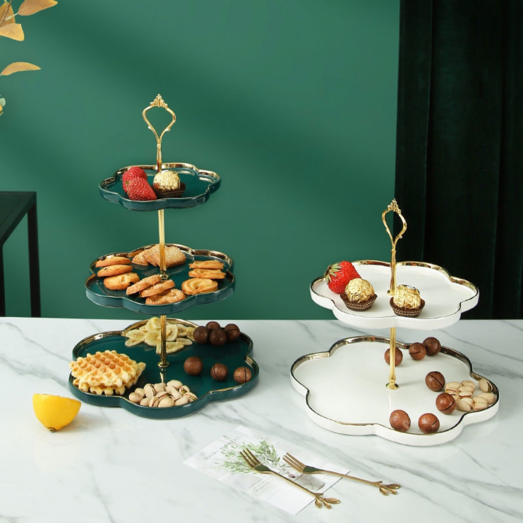 ASHOME Piring Kue Tingkat Keramik Bentuk Bunga List GOL& / Double Layer Dessert Cake / Piring Kue Tingkat Mewah / Piring Kue Tingkat Elegan