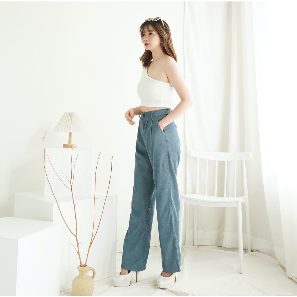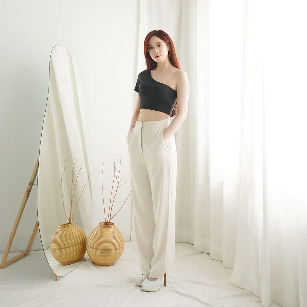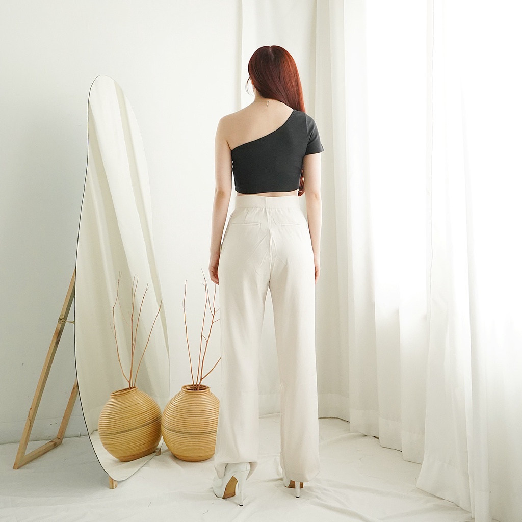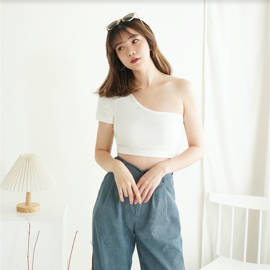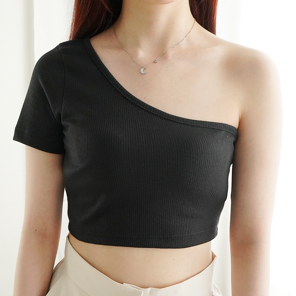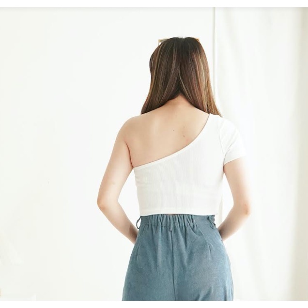 Crop Top Atasan Wanita Knit One Shoulder Rajut