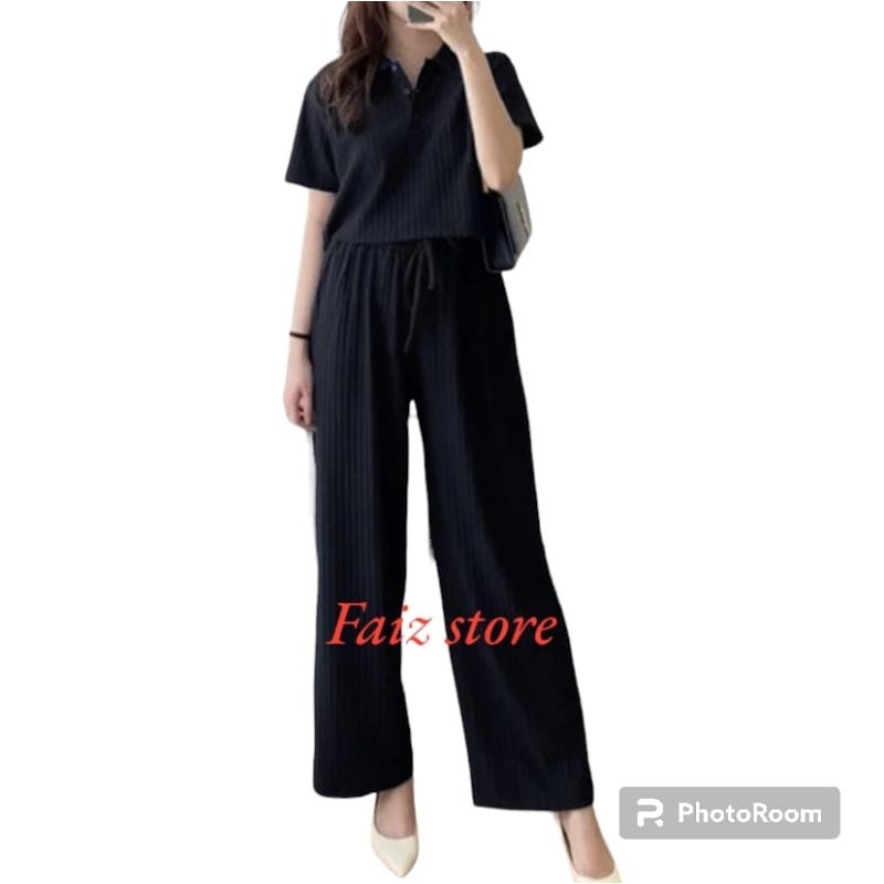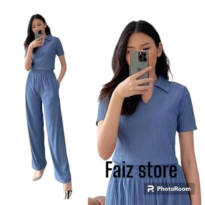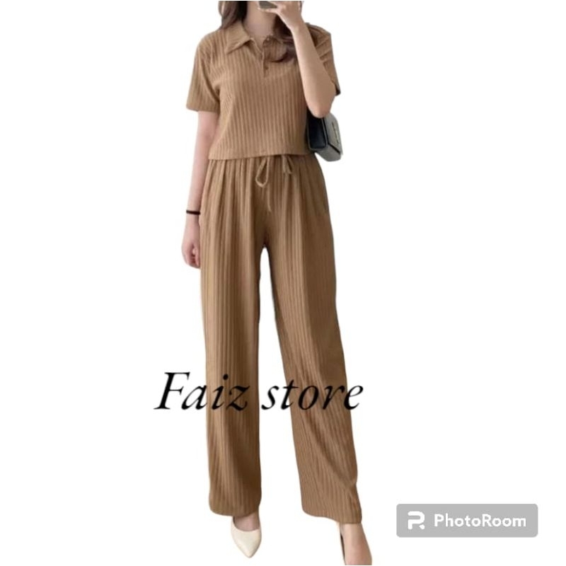 Oneset Knit Polo Crop Top Setelan Celana Panjang Rib Knit Wanita