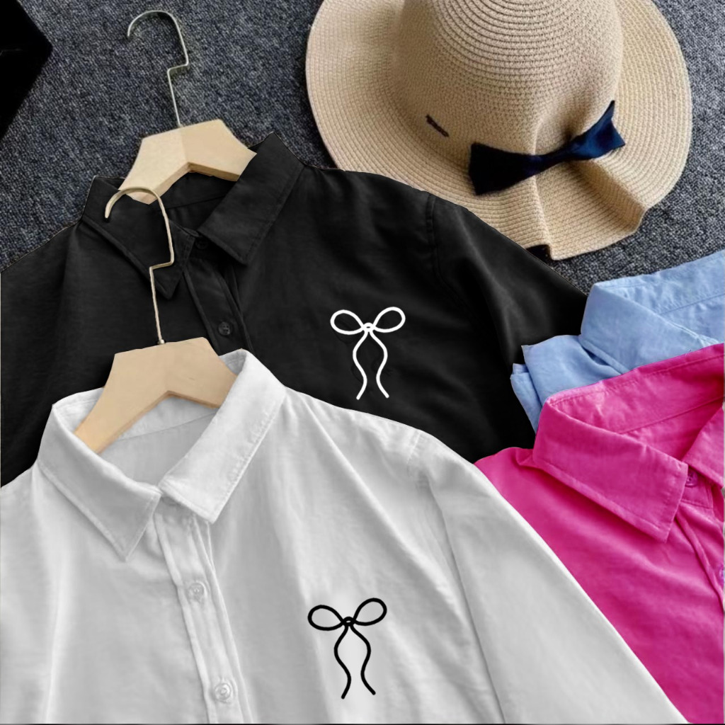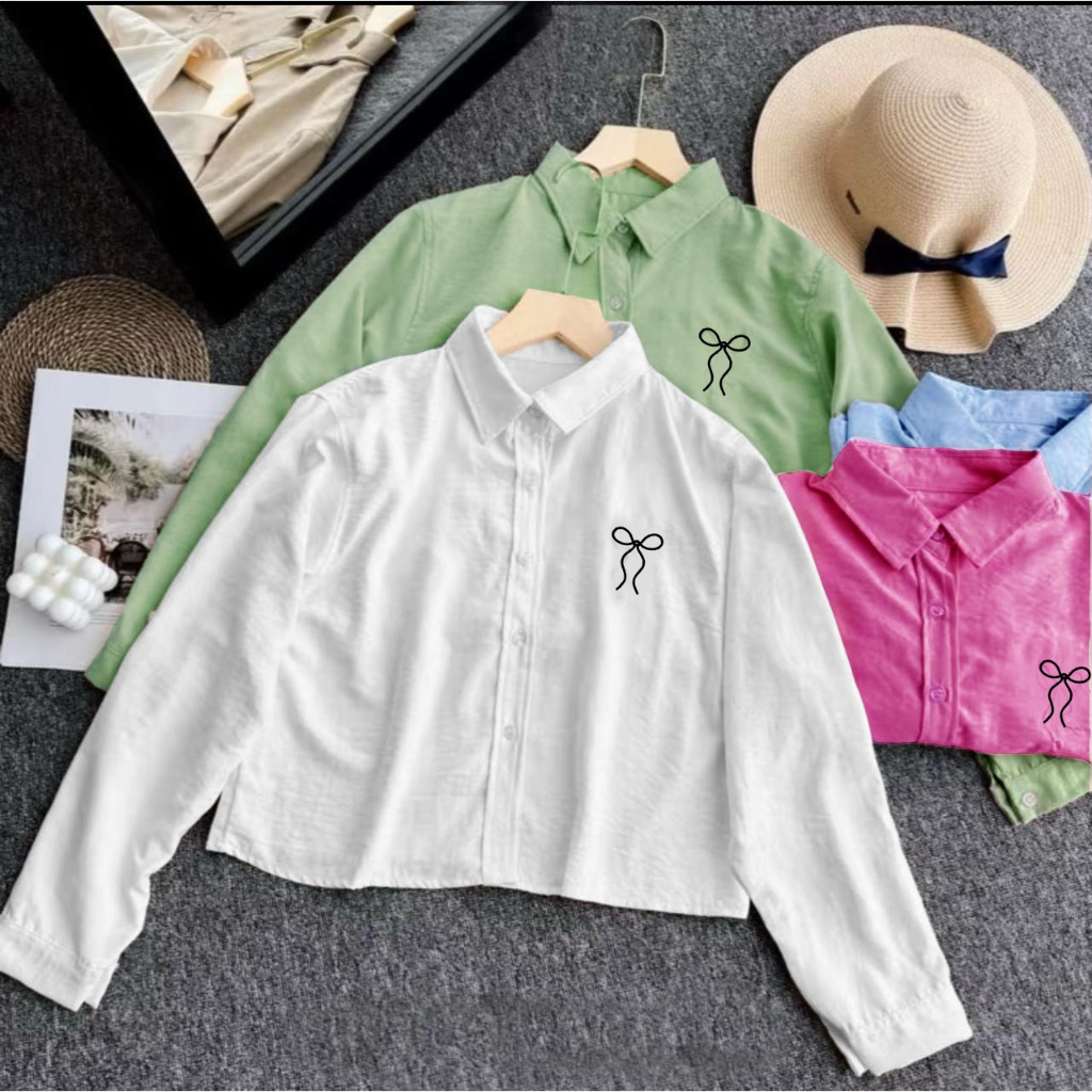 Crop Top Kemeja Katun Motif Pita Ribbon Atasan Wanita Santai