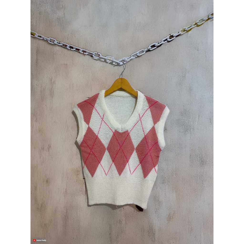 Korean Diamond Plaid Knit Vest Crop Top Rompi Rajut Stylish