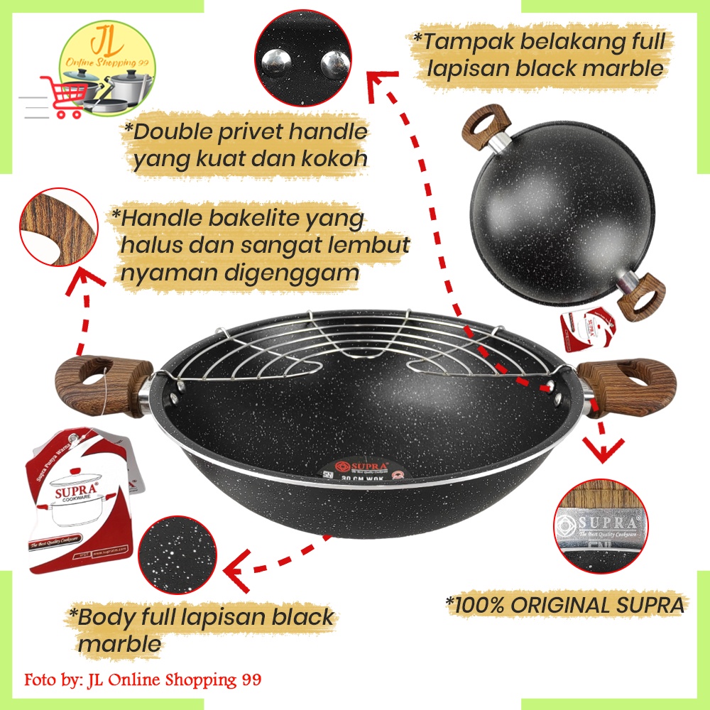 SUPRA Wok set 30cm black marble + peniris + sodet / wajan kuping kuali penggorengan anti lengket
