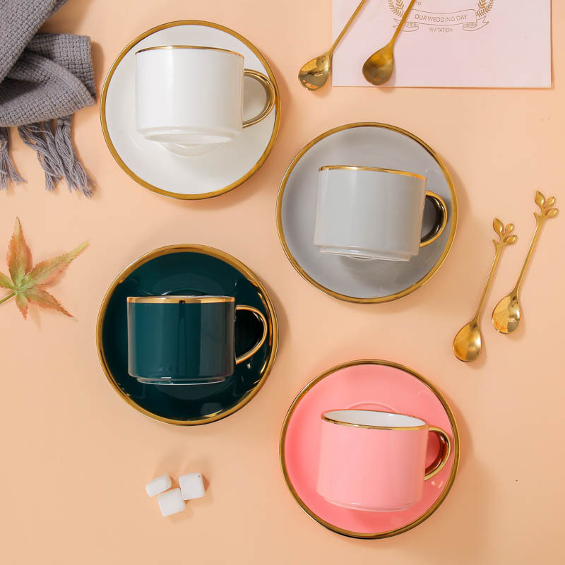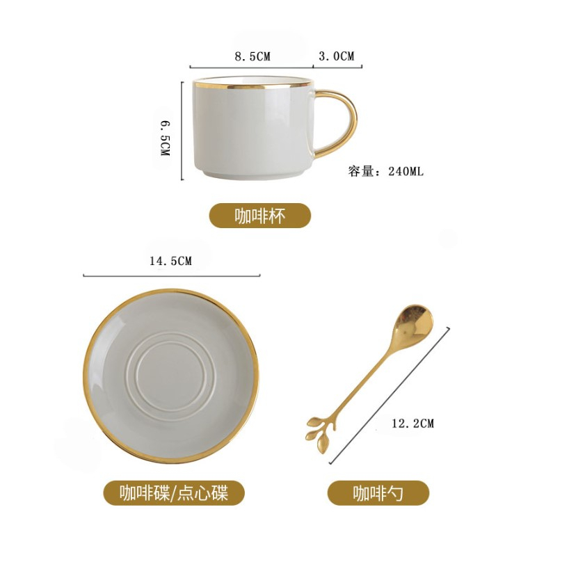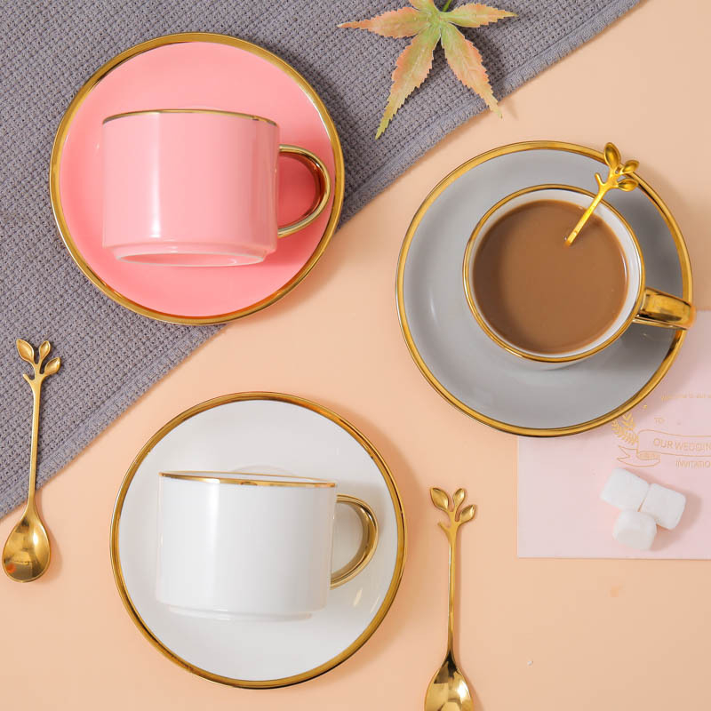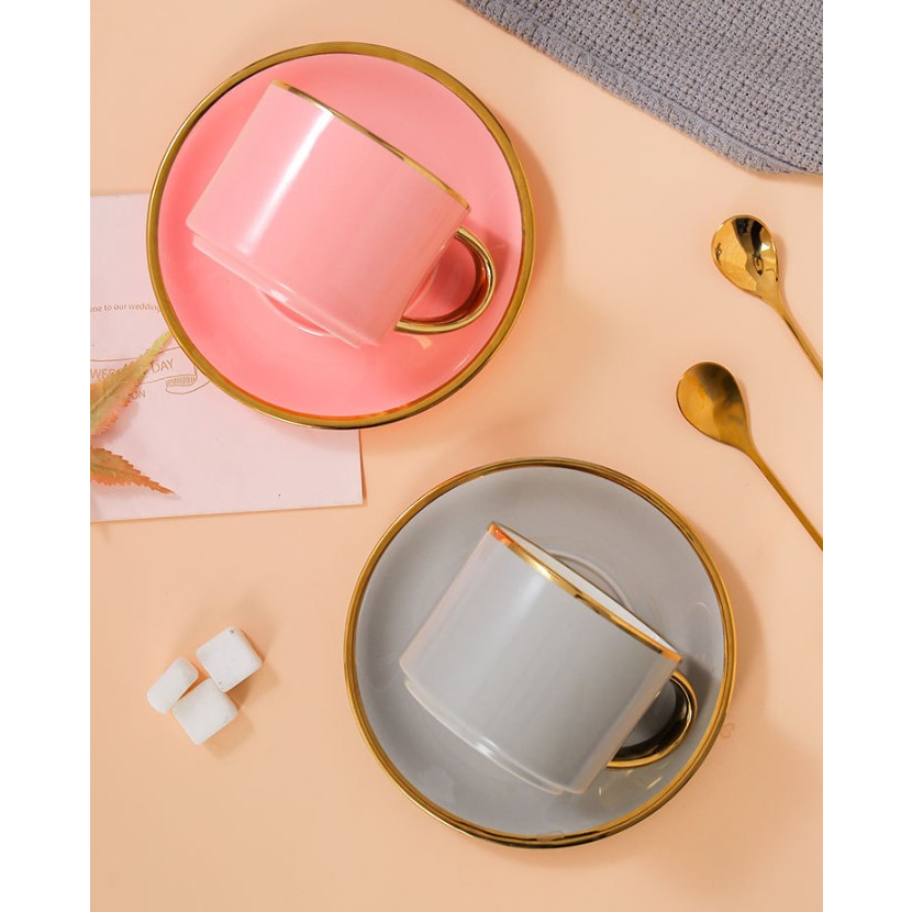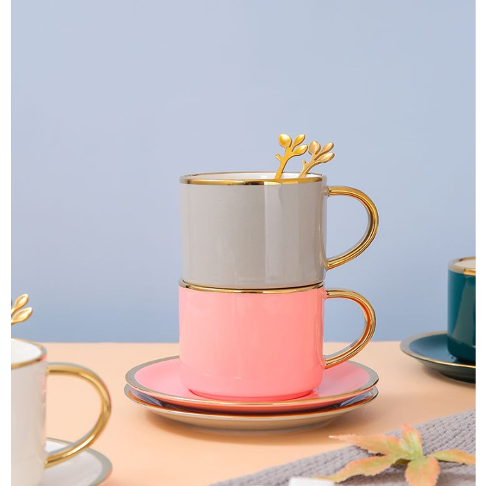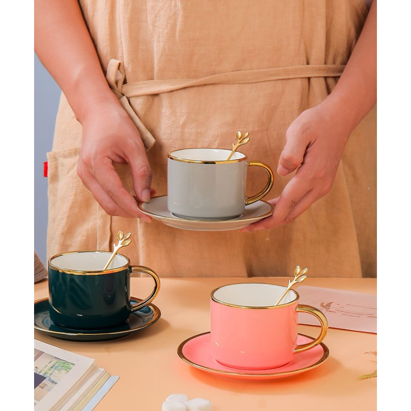 ASHOME Cangkir Keramik Glossy List Elegan Dengan Sendok dan Piring / Ceramic Tea Cup Elegant / Cangkir Kopi Aestetik / Cangkir Teh Mewah