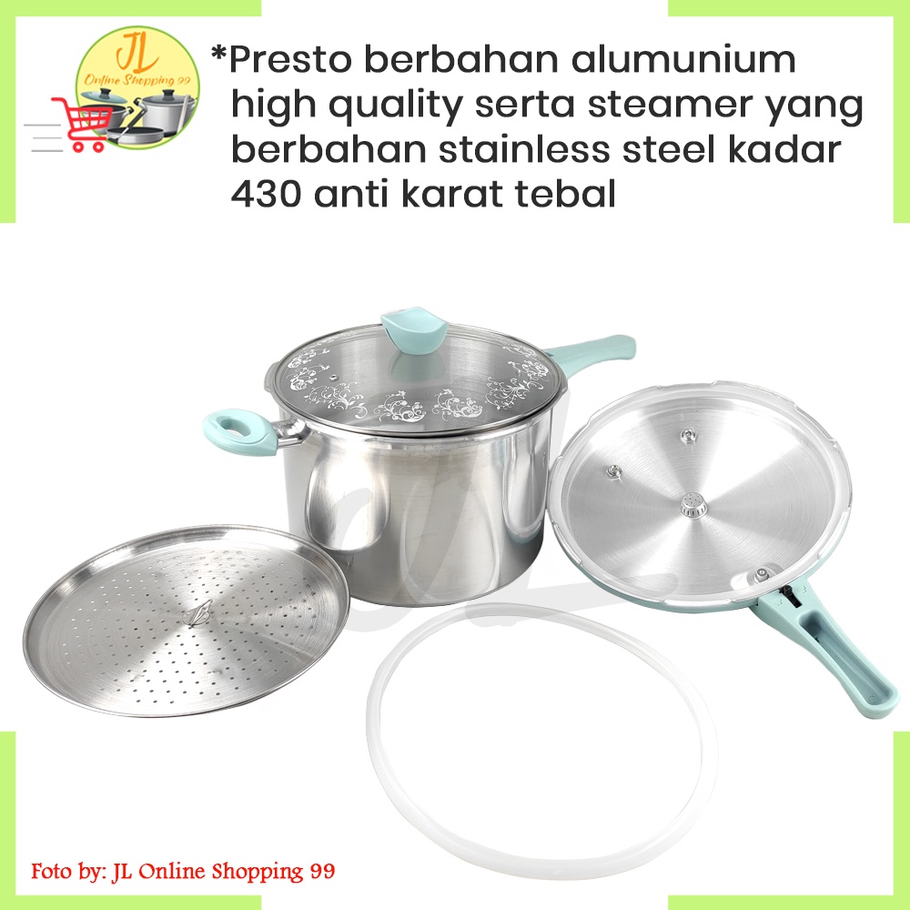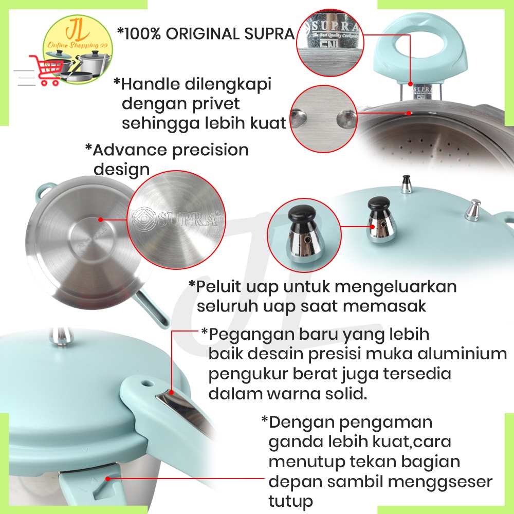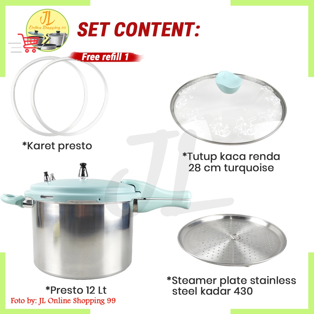 New SUPRA Panci presto 12liter + steamer tutup kaca pastel Turqouise / pressure cooker alumunium / pengempuk kukusan