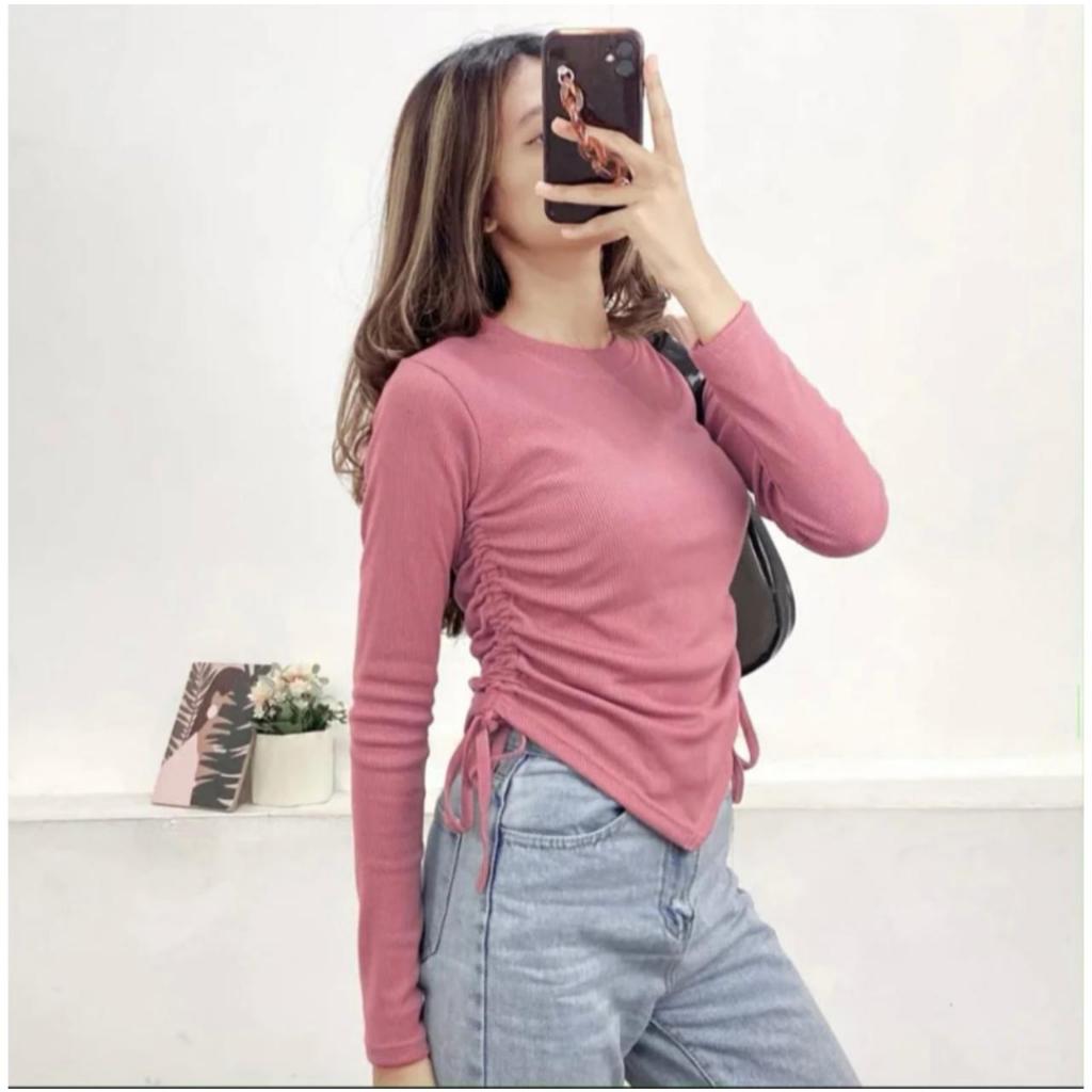 Crop Top Serut Samping Kerut Tali Korea Lengan Panjang Model Knit