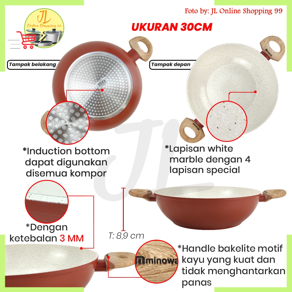 MINOWA wok 30cm white marble series rosela ceramic anti lengket WK-30 / wajan penggorengan / kuali listrik induksi