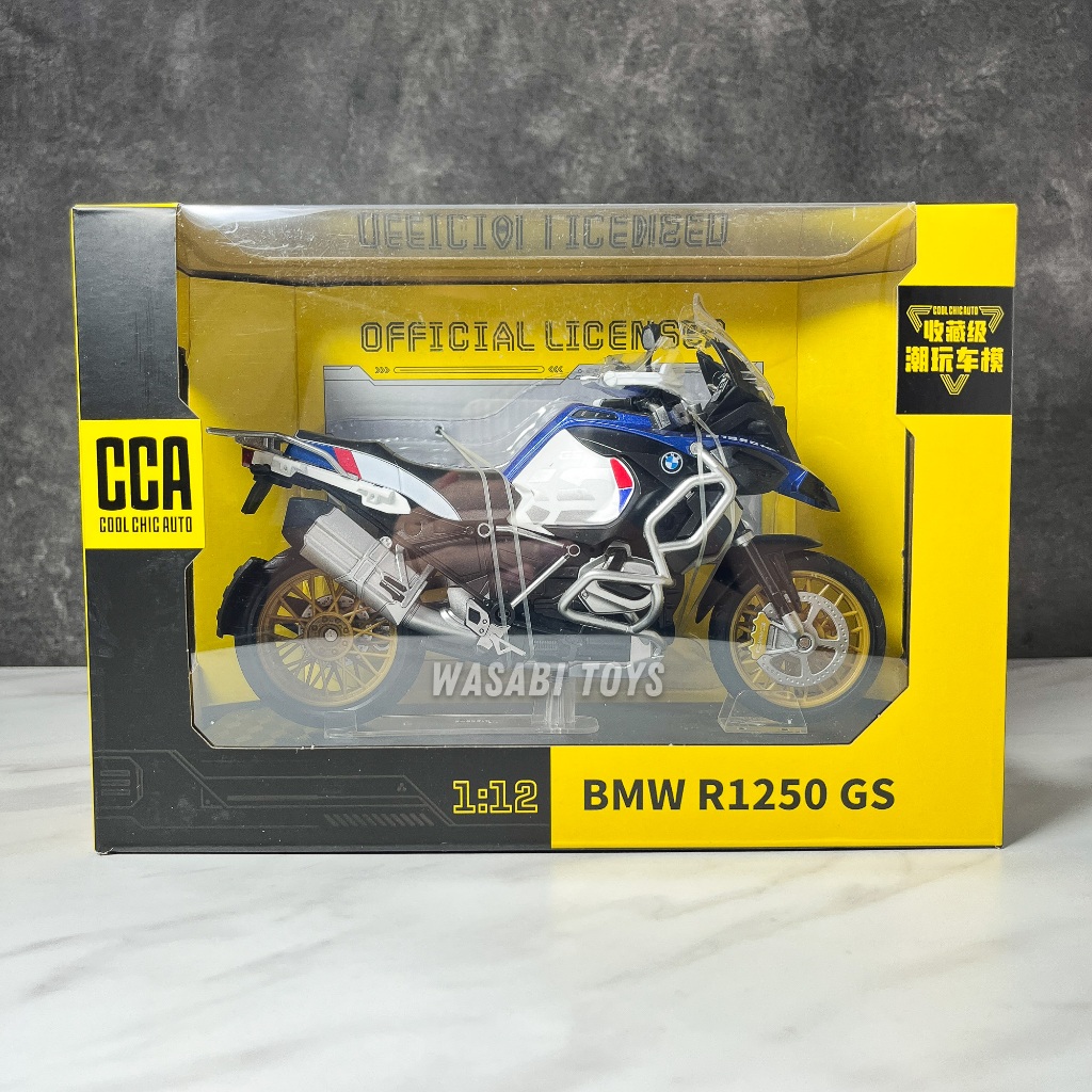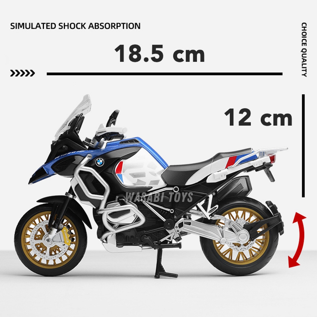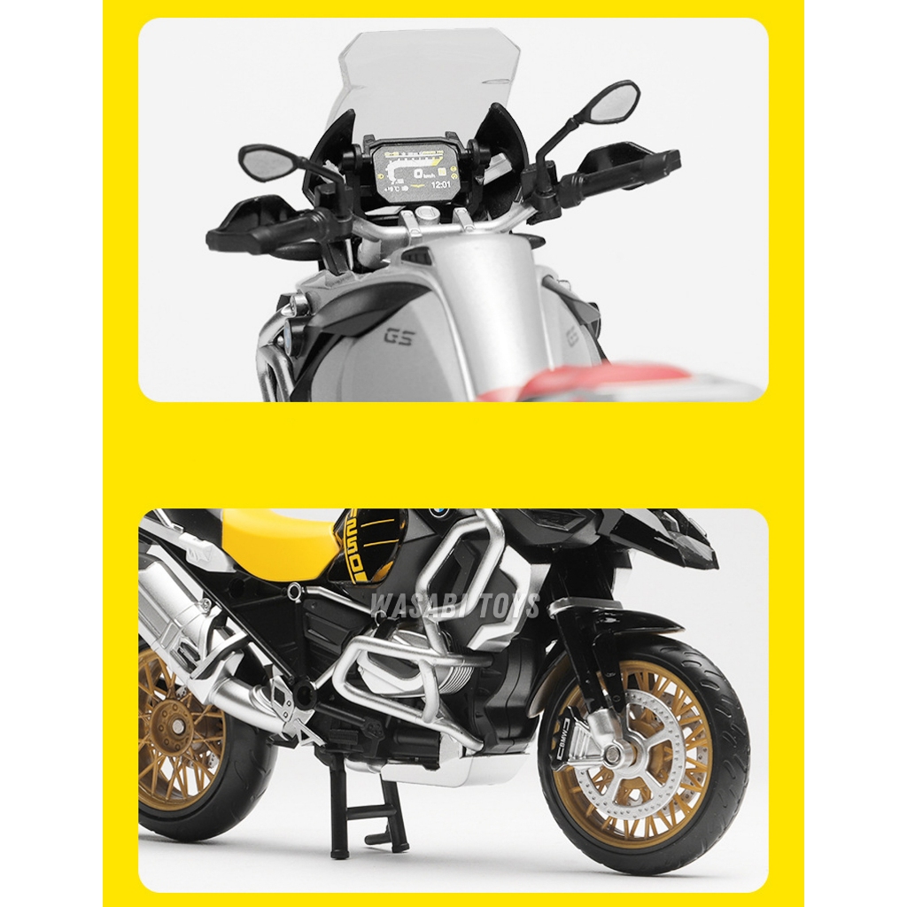 Diecast 1:12 Motor BMW R1250 GS (Dapat Alas Dudukan, Tanki Bensin Logam, Ban Karet, Shock Breaker)