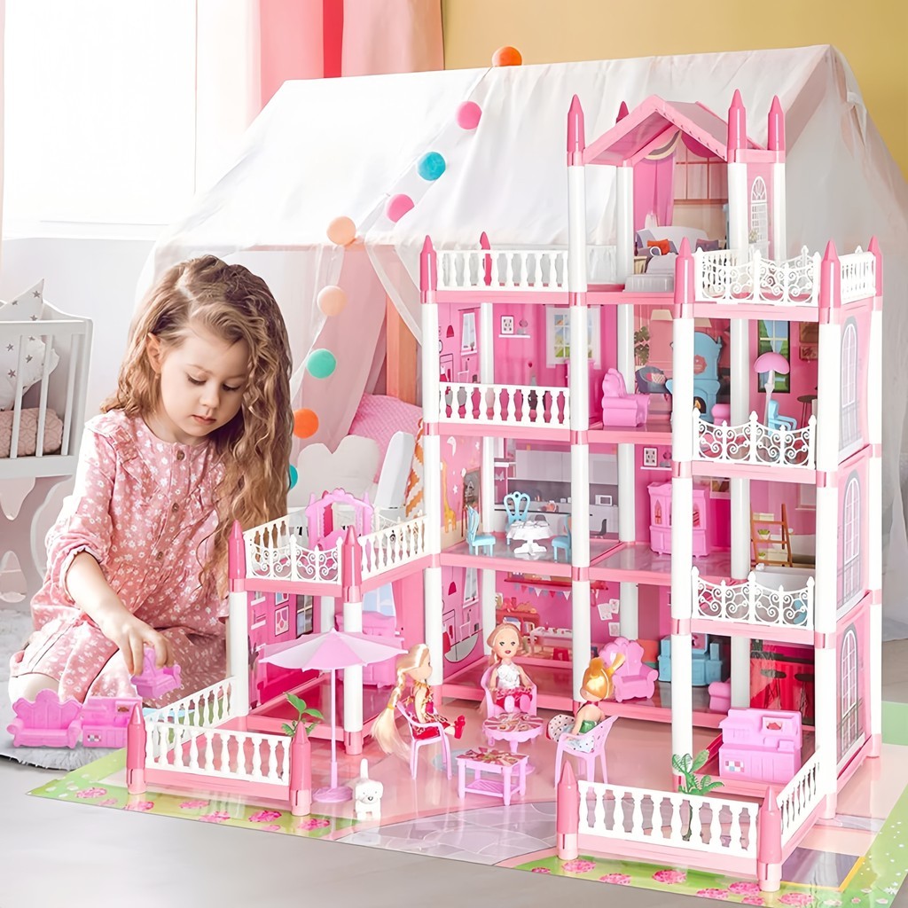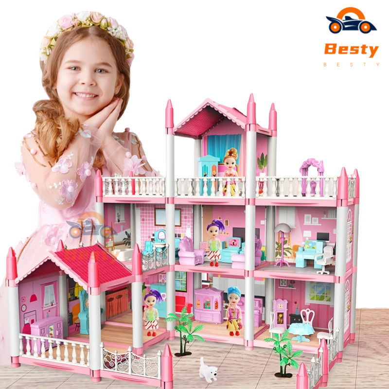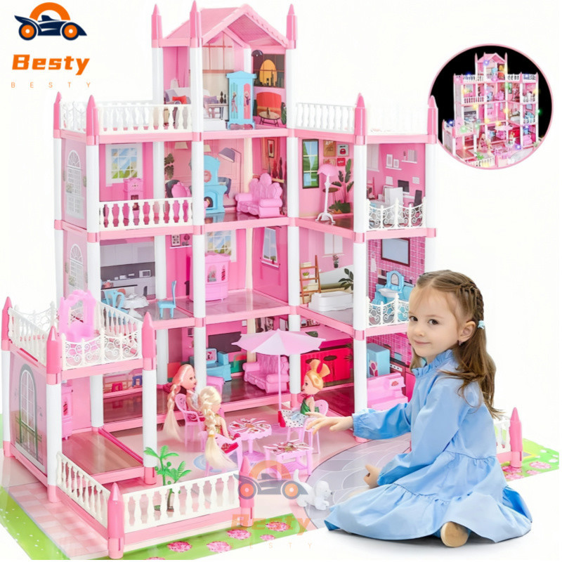 Besty DIY Bermain Rumah Vila Putri 3D Mainan Kastil Rumah Boneka Gratis Strip Lampu Dan Boneka Kain