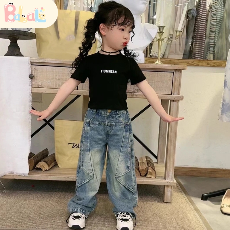 BALALE - SETELAN JEANS ANAK PEREMPUAN T-SIRT LENGAN PENDEK & CELANA JEANS KOREA COOL KANTUNG BESAR