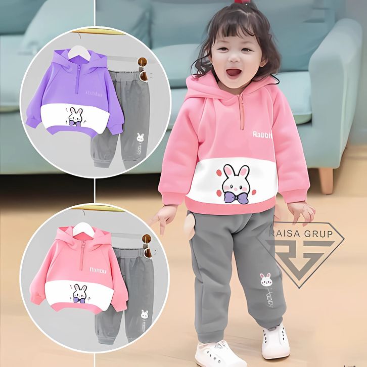 Setelan Hoodie Anak Perempuan motif rabbit usia 1-5 tahun pakaian anak terbaru 2024