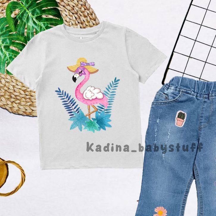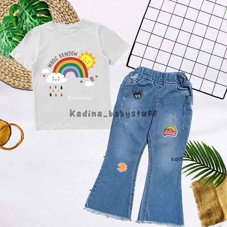 (Terbaru) SETELAN JEANS ANAK PEREMPUAN/ CELANA CUTBRAY BORDIR UNICORN FLAMINGO RAINBOW/ KAOS MOTIF SABLON ANAK Usia 1-10