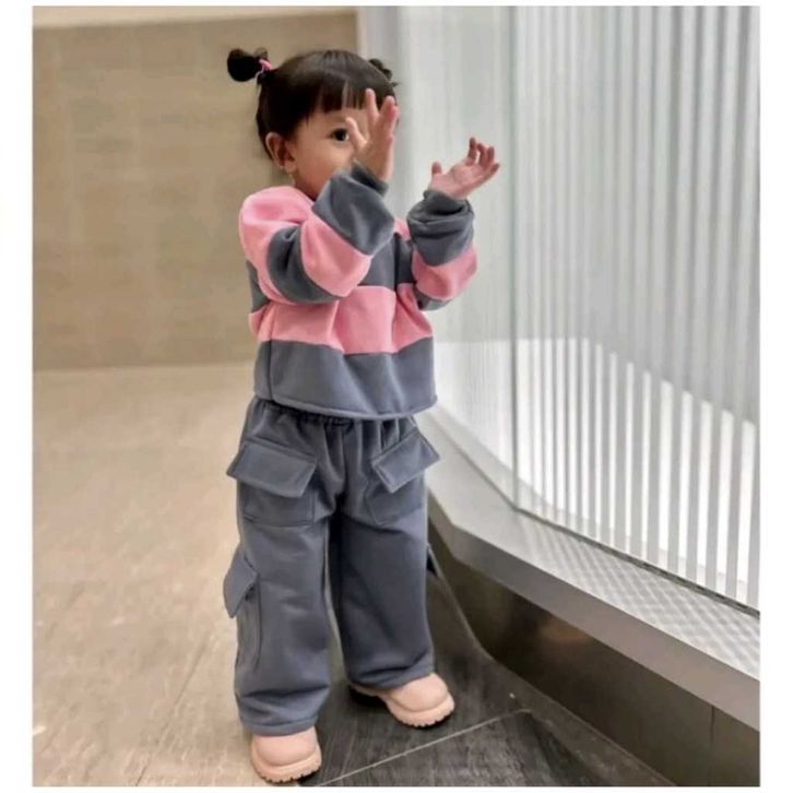 Setelan Baju Sweater Anak Perempuan Celana Cargo Atasan Sweater Bebyterry Strip Umur 1-12 Tahun Terbaru