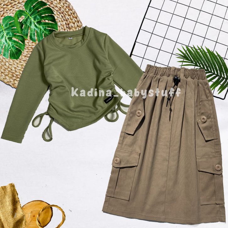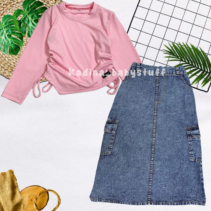 Setelan Anak Perempuan / Rok Kargo Jeans Anak dan Kaos Serut knit usia 2-12 tahun