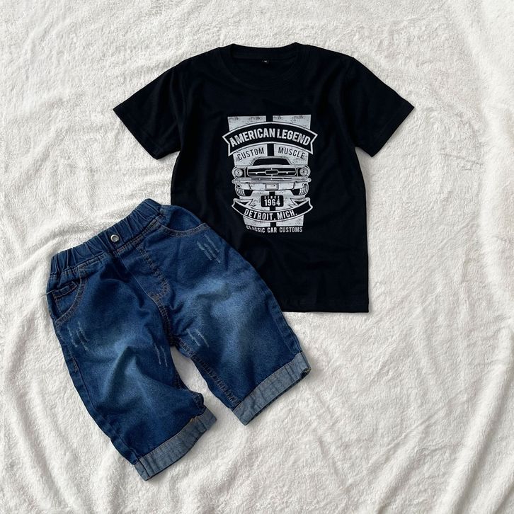 Setelan Celana Jeans Pendek Anak Dan Kaos Distro Bahan Katun Usia 3-12 Tahun