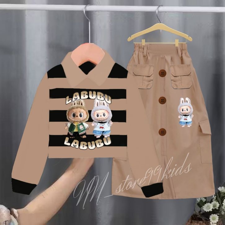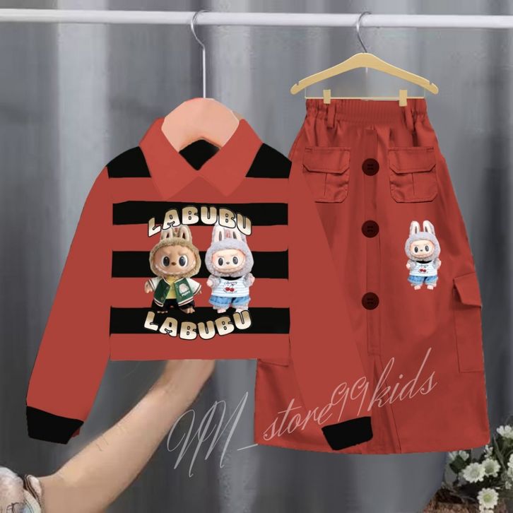 SETELAN ROK KARGO ANAK PEREMPUAN SALUR LABUBU/ BAJU ANAK SALUR KERAH LABUBU 2-12 TAHUN