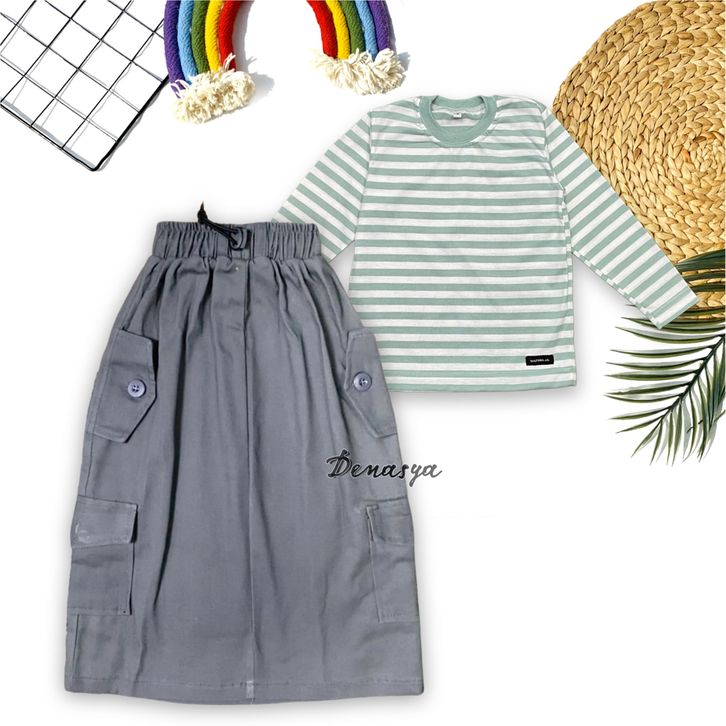 SETELAN ROK CARGO KATUN ANAK PEREMPUAN / ONE SET KAOS STRIPE BELANG ANAK USIA 1-12 TAHUN KEKINIAN