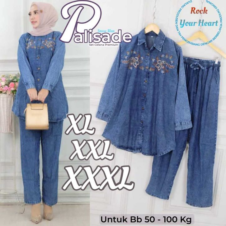 Setelan Wanita Jeans ada juga Jumbo Pakaian Denim One Set Premium Bordir Bunga Perempuan Busui HQ