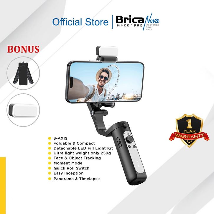 Brica B-Steady XS 2 - 3- Gimbal + Magnetic Fill Light + Tripod + Carrying Pouch – Black - BSX2