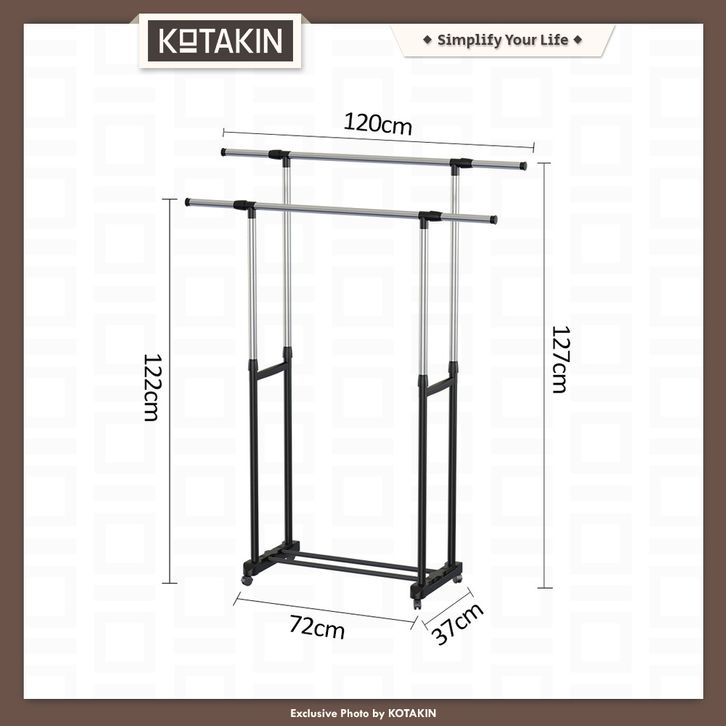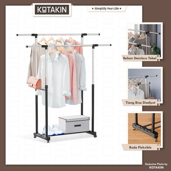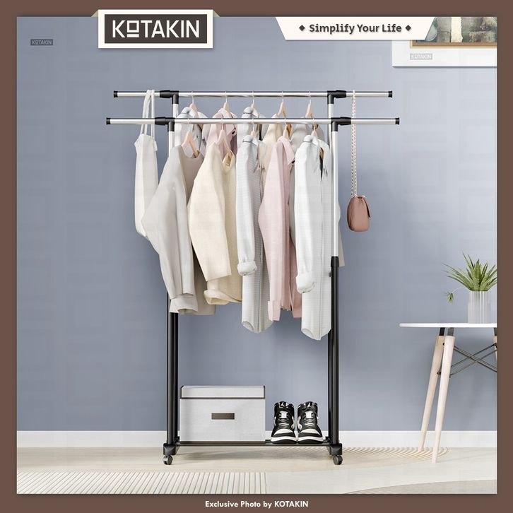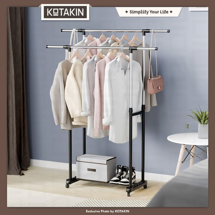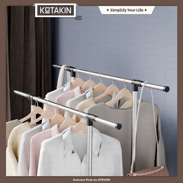 KOTAKIN Stand Hanger Pakaian Double 2 Sisi Portable Rak Gawang Gantungan Baju Besi Stainless Steel