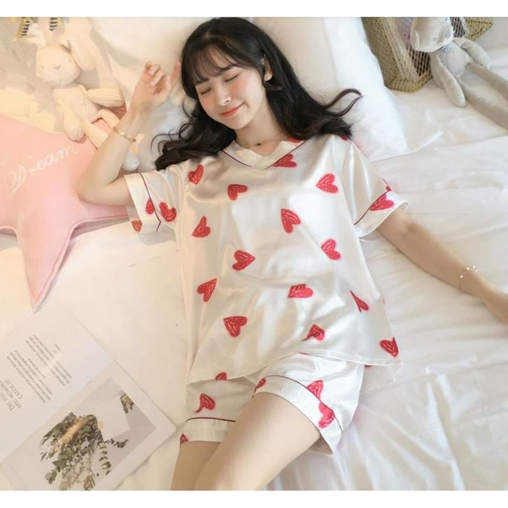 Piyama wanita satin halus celana pendek dan kaos lengan pendek 1 set