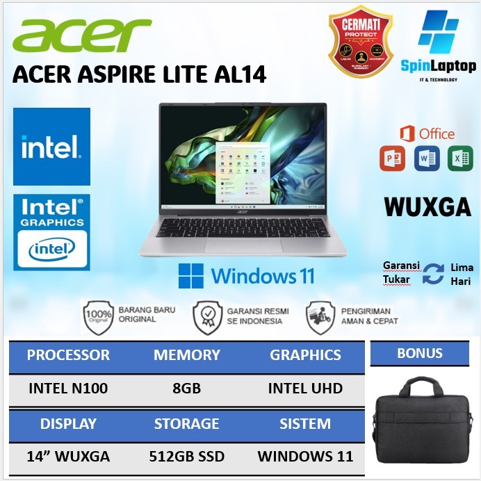 laptop acer aspire lite AL14 INTEL N100 Ram 8GB ssd 512GB Baru Garansi Resmi