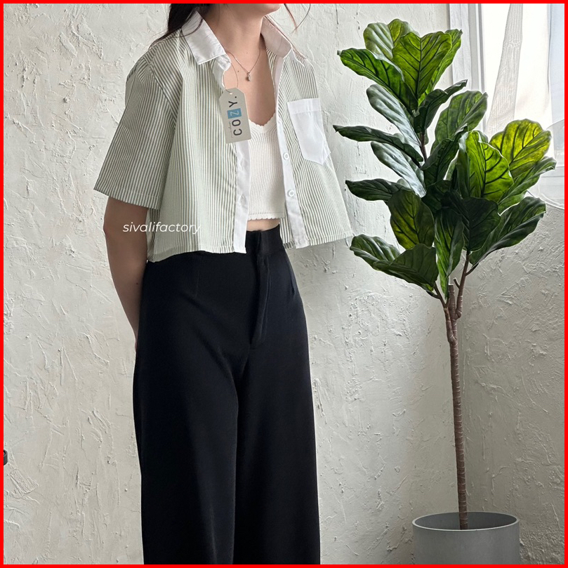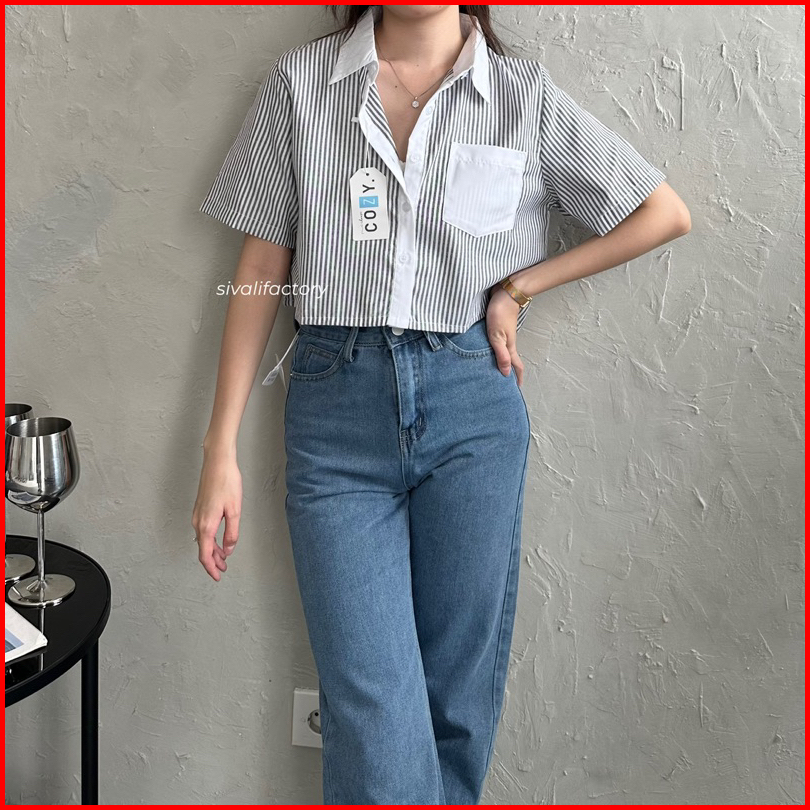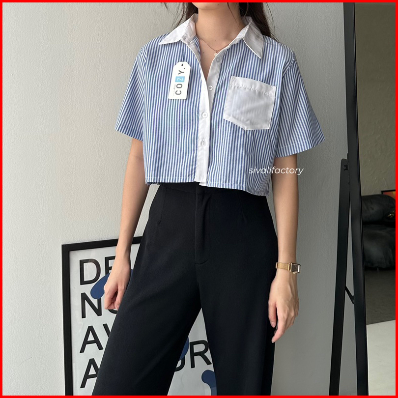 Sivali Gia Stripe Shirt Crop Stripe Shirt Kemeja Wanita Salur Lengan Pendek Atasan Wanita Garis 123