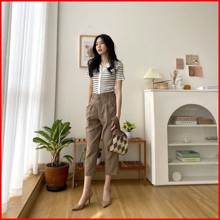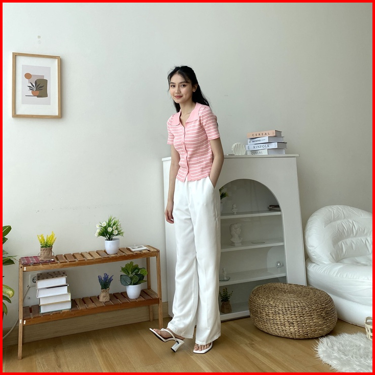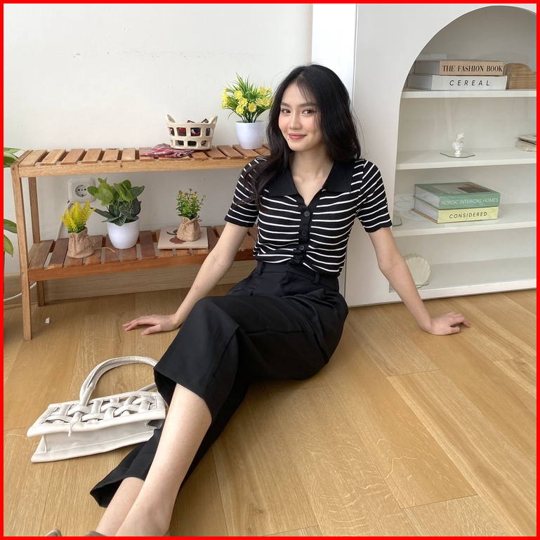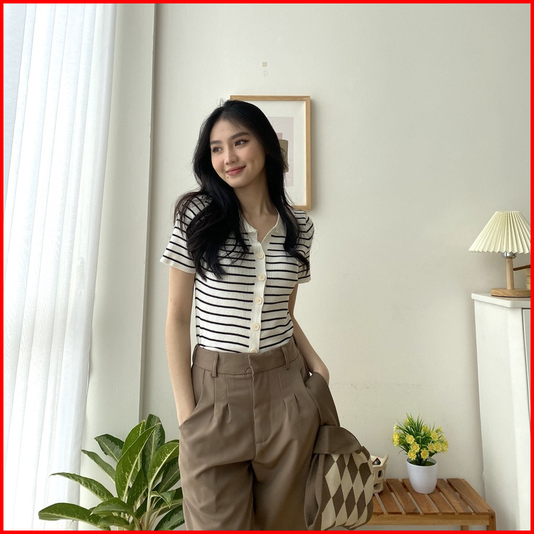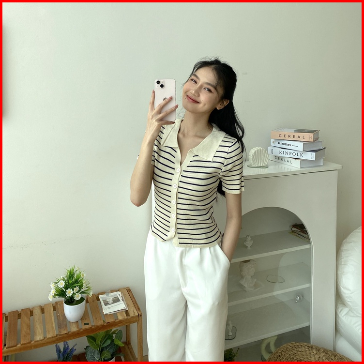 Kaorithelabel Meggy Knit Top Atasan Rajut Wanita - Blouse Salur Short Sleeve - Korean Casual Look