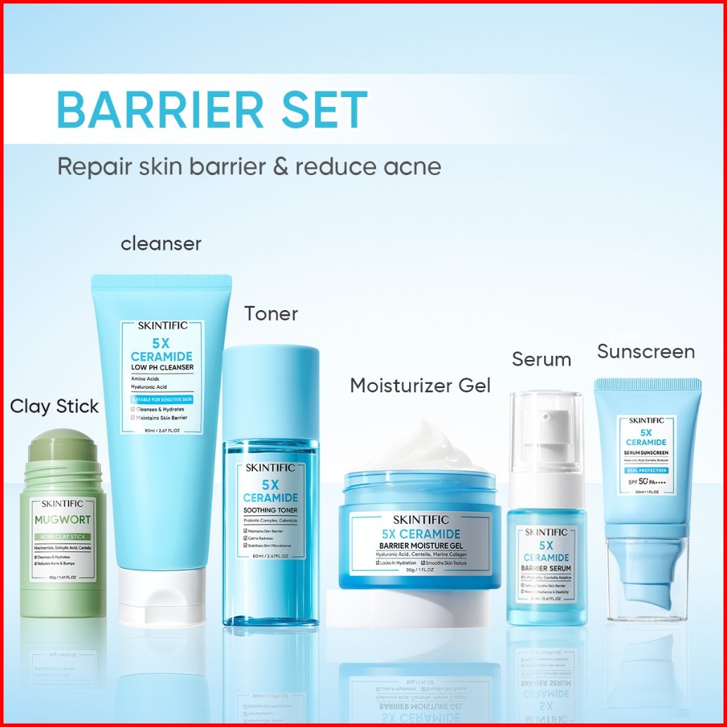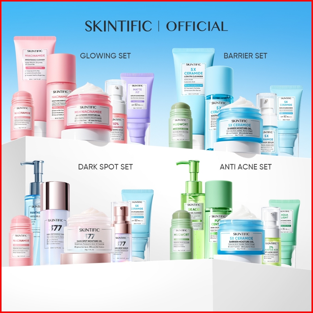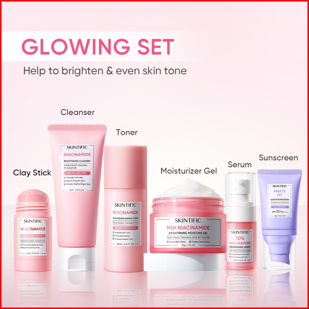 Skintific-6pcs Paket-skincare Set Serum Moisturizer Gel Toner Sunscreen Cleansing Mouss Facial Wash Day Night Cream Acne