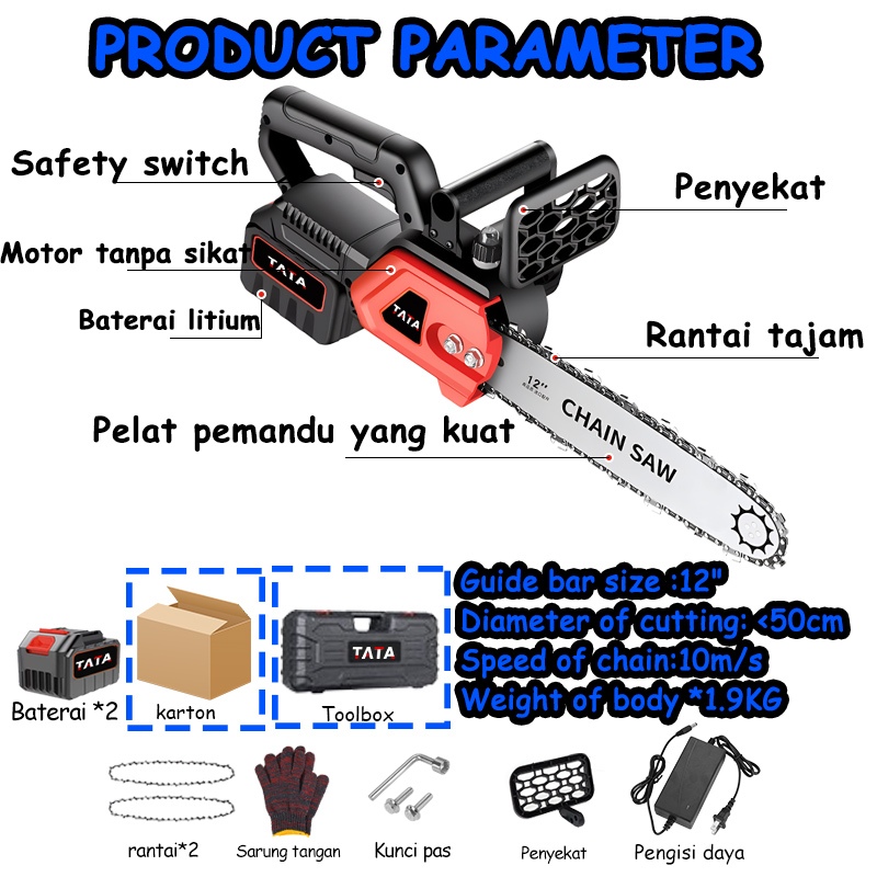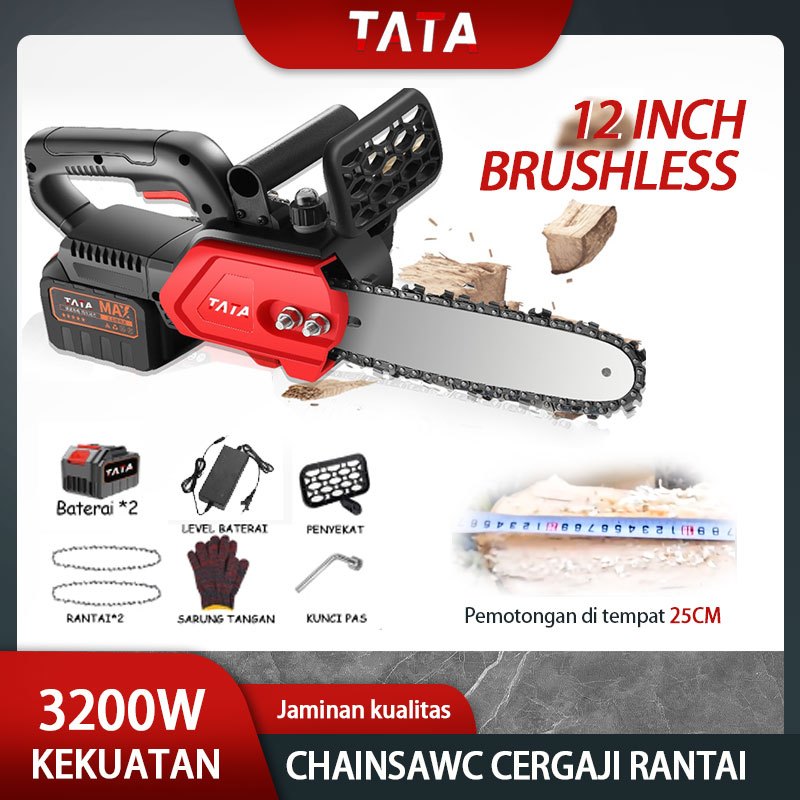 【】⚠️ ⚠️ TATA Ready stock 12 Inch Chainsaw Gergaji Mesin Listrik Rantai Elektrik Mini Portable Genggam Lithium Baterai 4