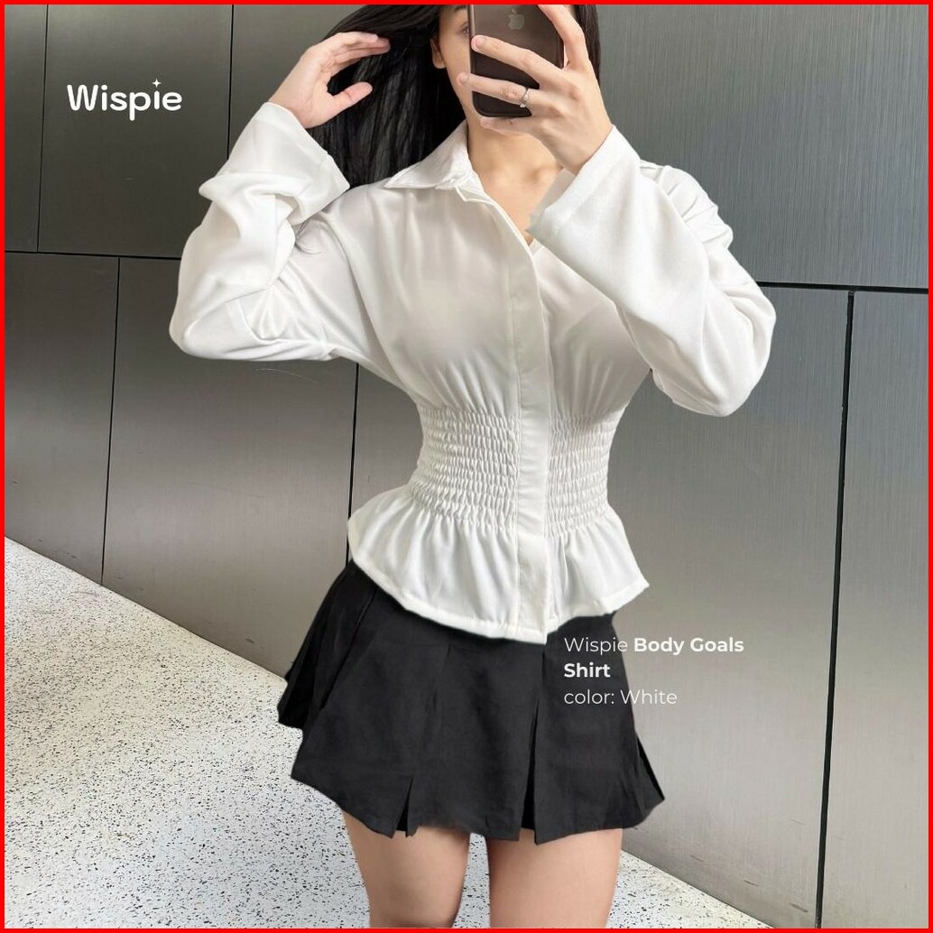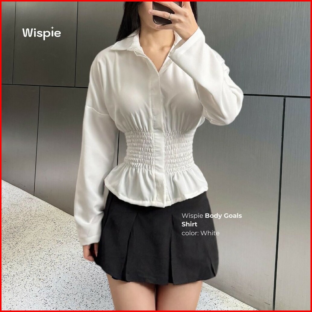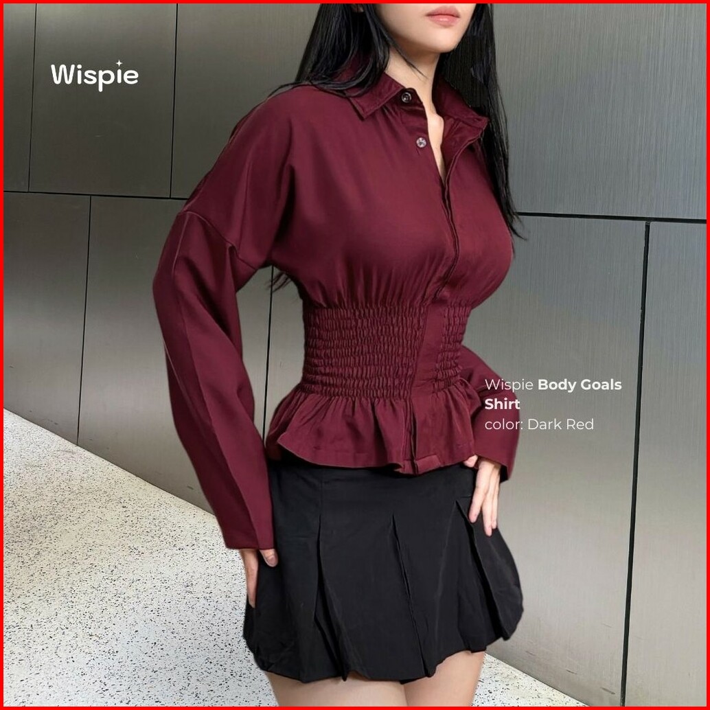 Wispie Body Goals Shirt Kemeja Kerja Fitted Wanita Karet Korset Maroon Putih Panjang Casual Shakila