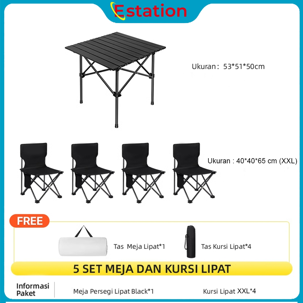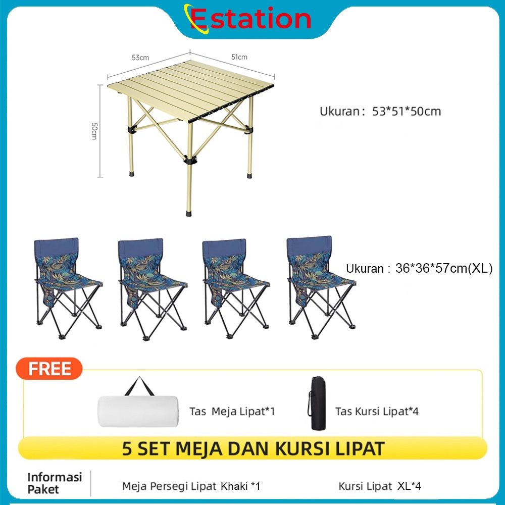 Estation - Meja Lipat Persegi Dan Kursi * 4pcs Full Set / Meja Lipat Outdoor Kursi Lipat Camping Folding Chair Serbagun