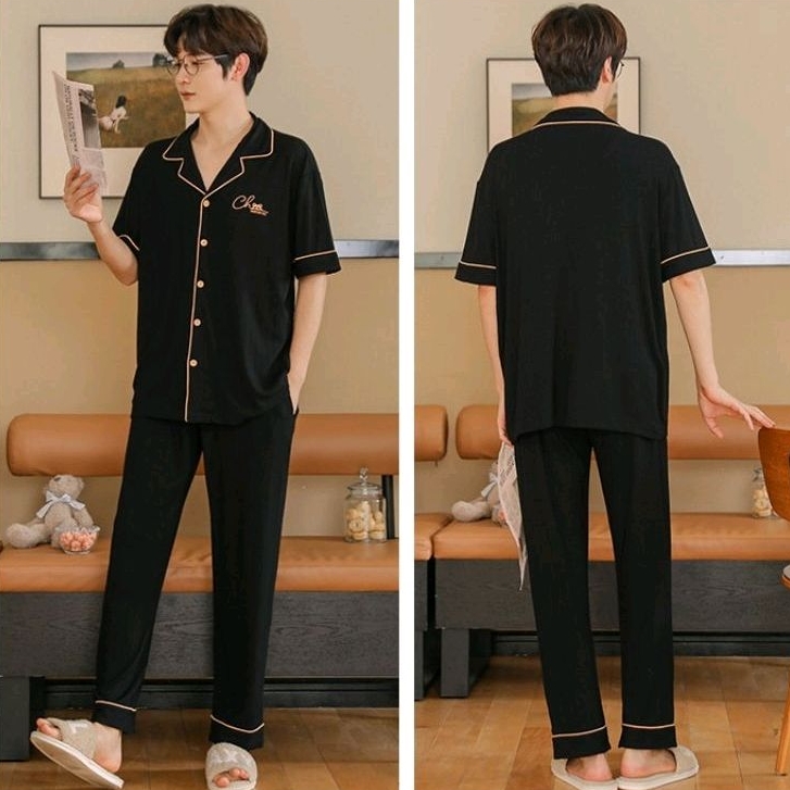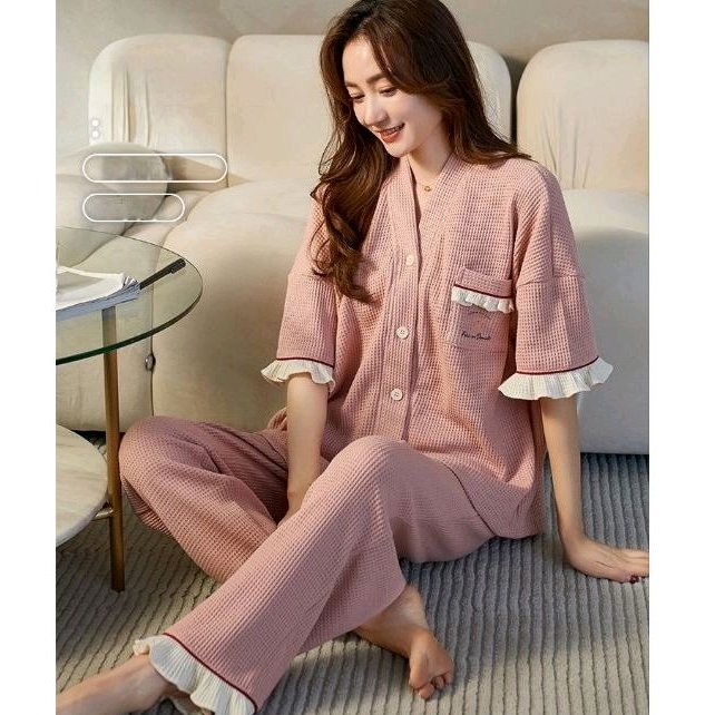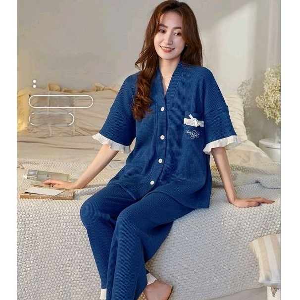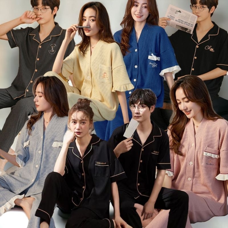 Rulif Piyama Baju Tidur Wanita Pria Couple Dewasa Bahan Katun Halus Lengan Pendek Celana Panjang Krah vneck Rebekka