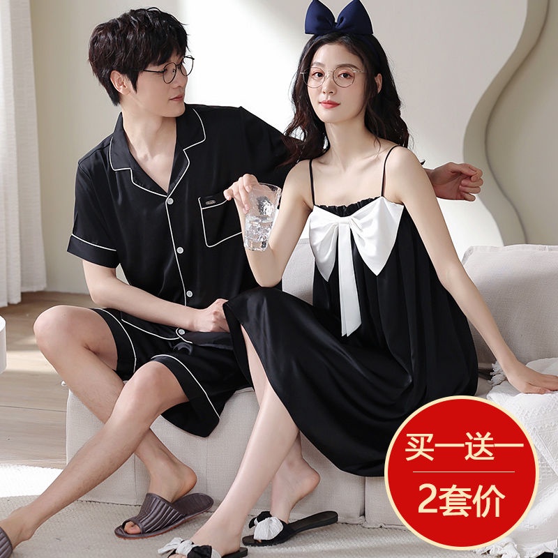 FRS Rumah Pasangan Piyama Piyama Sutra Es Sutra Tipis Lengan Pendek Set Dua Potong