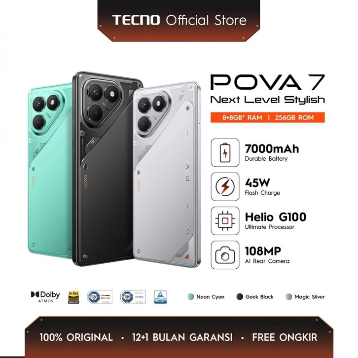 [Mall] TECNO POVA 7 8+8GB/256GB, 7000 mAh, Mediatek Helio G100 Ultimate, 120Hz Vivid Display , 108MP + 2MP Macro Camera