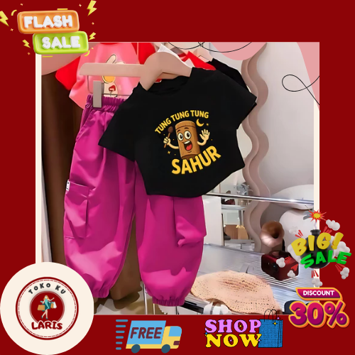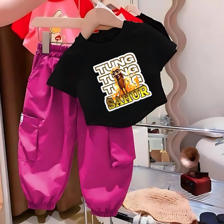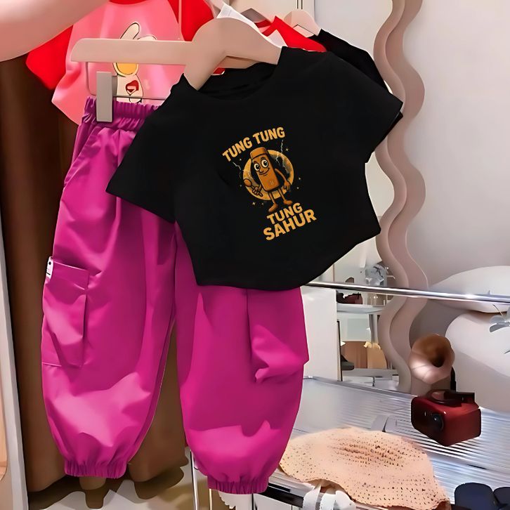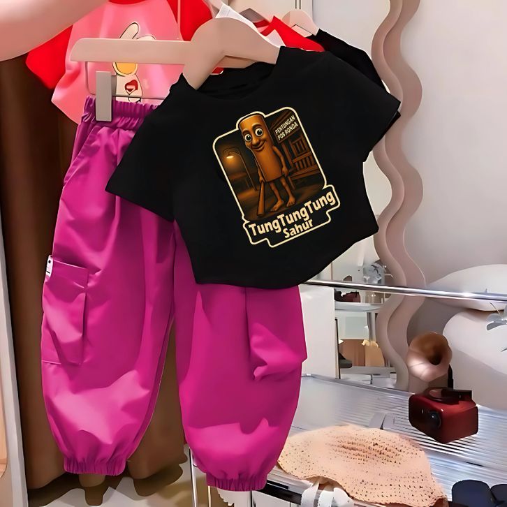 Setelan Anak TUNGTUNG SAHUR | Kaos Katun + Celana Cargo Joger Unik | Size 1-5 Tahun | Adem & Lucu Setelan Anomali Murah