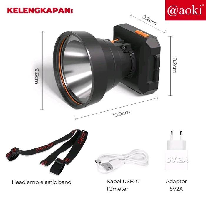 SENTER KEPALA LED AOKI 60 WATT AK-3702A CAHAYA TERANG TAHAN LAMA 9000mAh