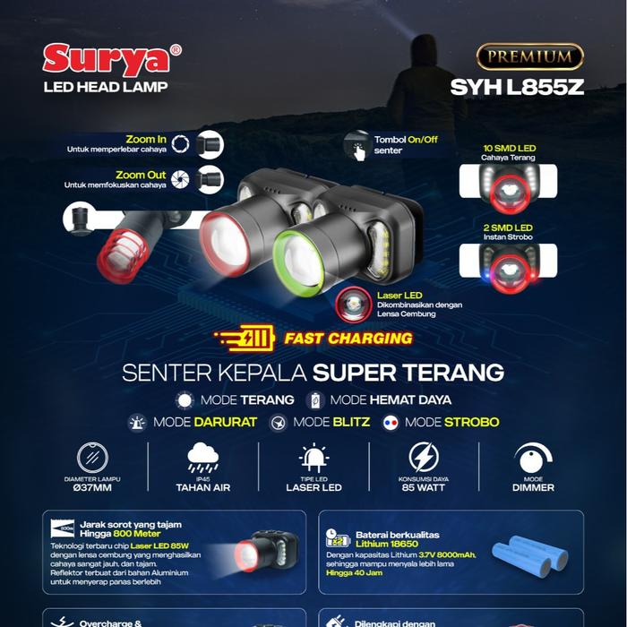 SENTER KEPALA LED LASER ZOOM SURYA SYH L855Z BATERAI 8000MAH TAHAN HINGGA 40 JAM - CAHAYA TERANG -