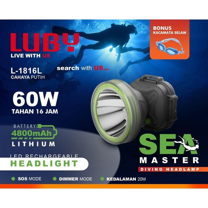 SENTER KEPALA SELAM LUBY 60WATT L-1816L 4800MAH TAHAN 16 JAM - ANTI AIR - CAHAYA TERANG PLUS